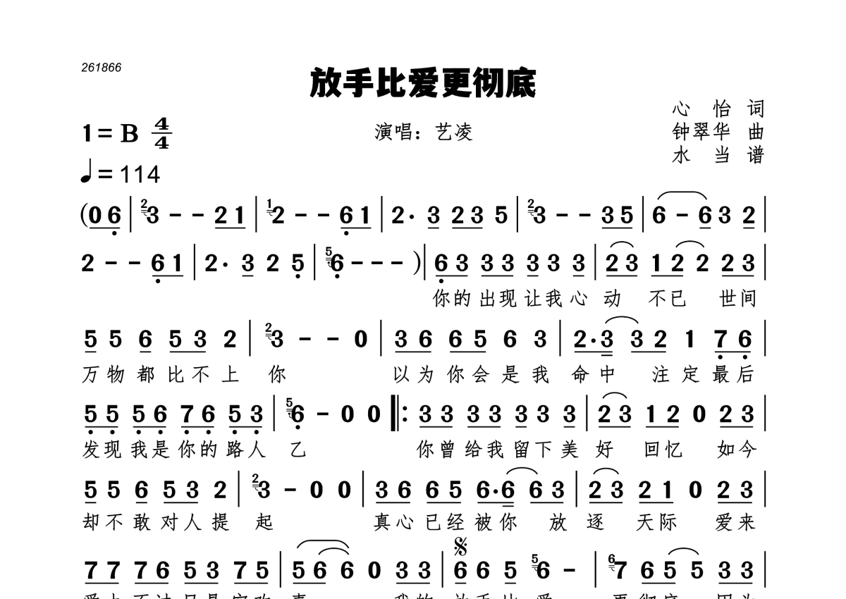 《放手比爱更彻底》是艺凌演唱的一首歌曲,拍号为4/4拍,歌曲速度为每分钟114拍,这份简谱共有一张高清图谱,图谱由 @水当 编配上传。
