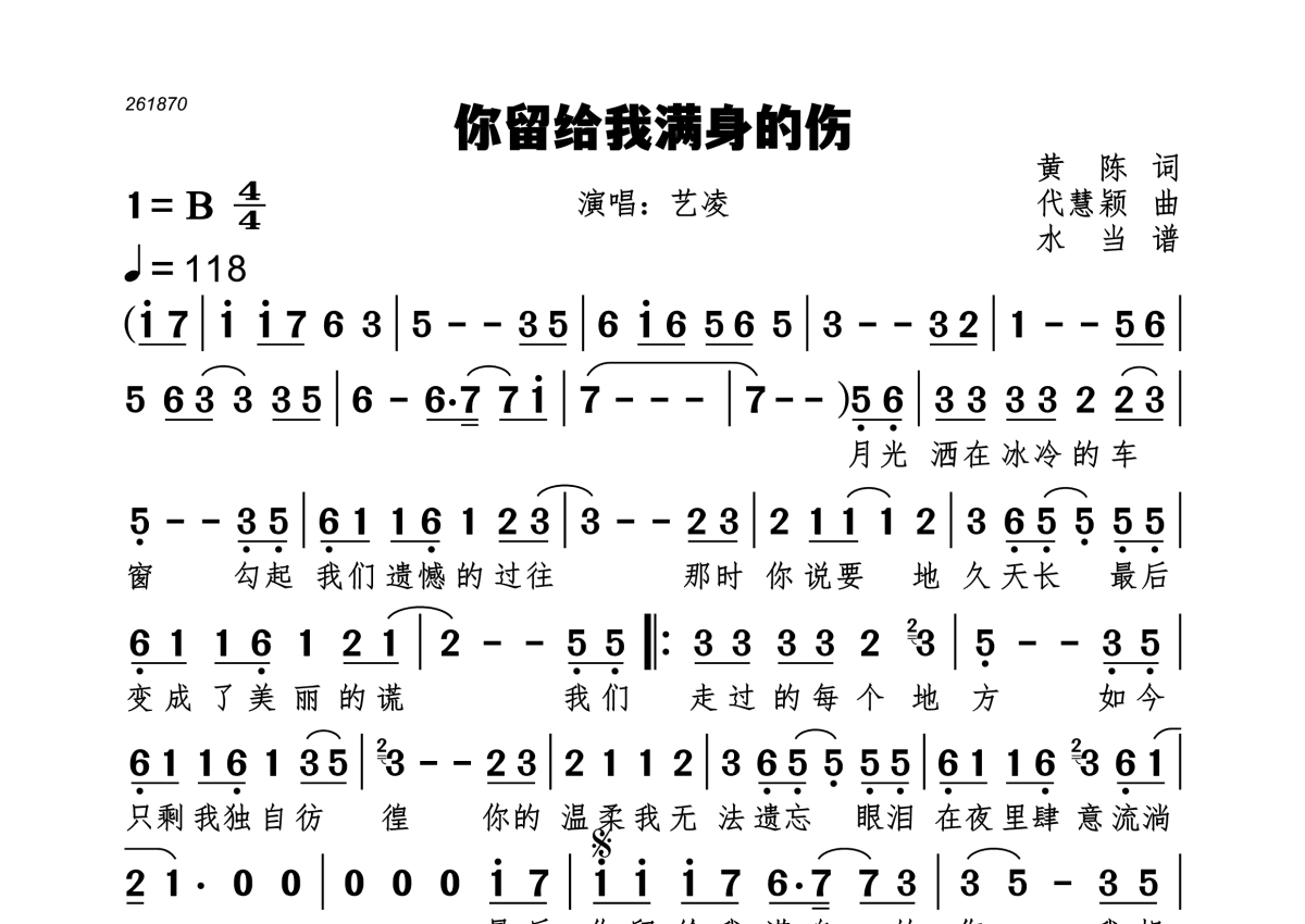 《你留给我满身的伤》是艺凌演唱的一首歌曲,拍号为4/4拍,歌曲速度为每分钟116拍,这份简谱共有一张高清图谱,图谱由 @水当 编配上传。