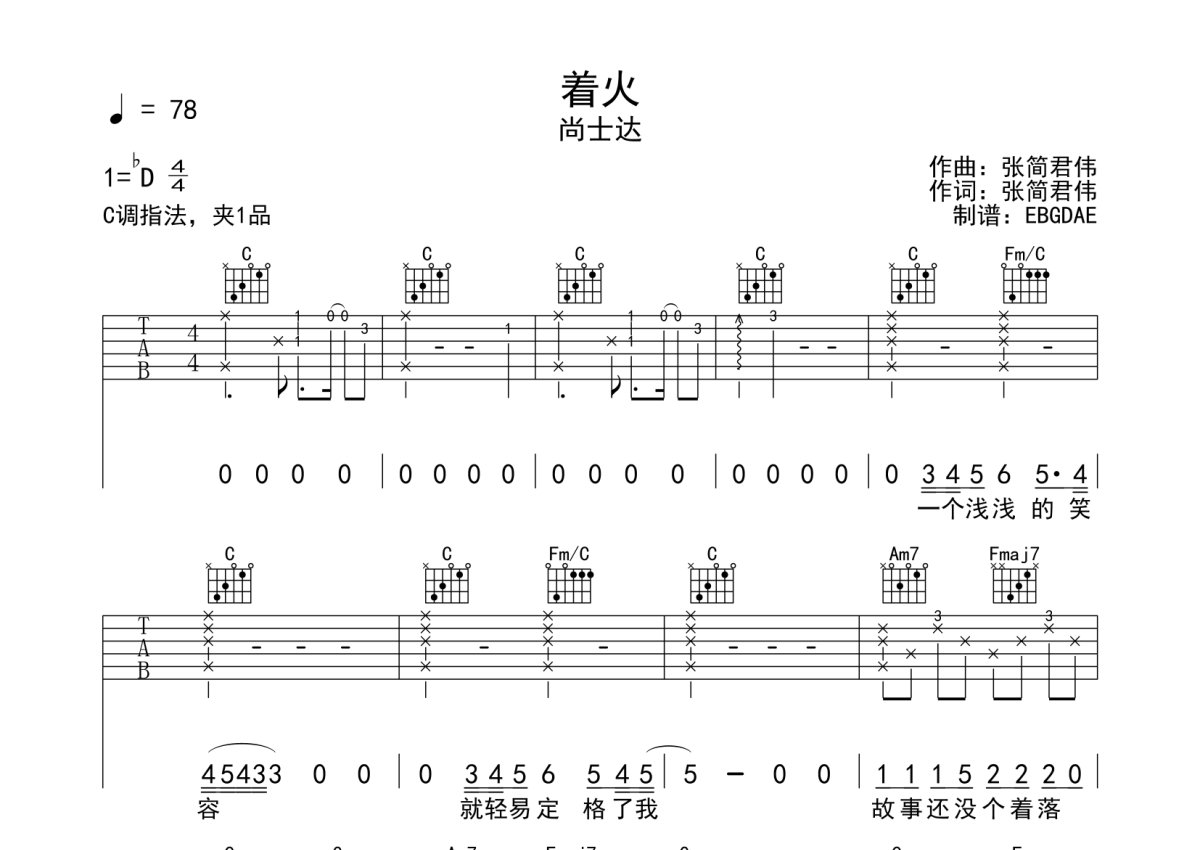 尚士达《着火》吉他谱 - C调弹唱六线谱