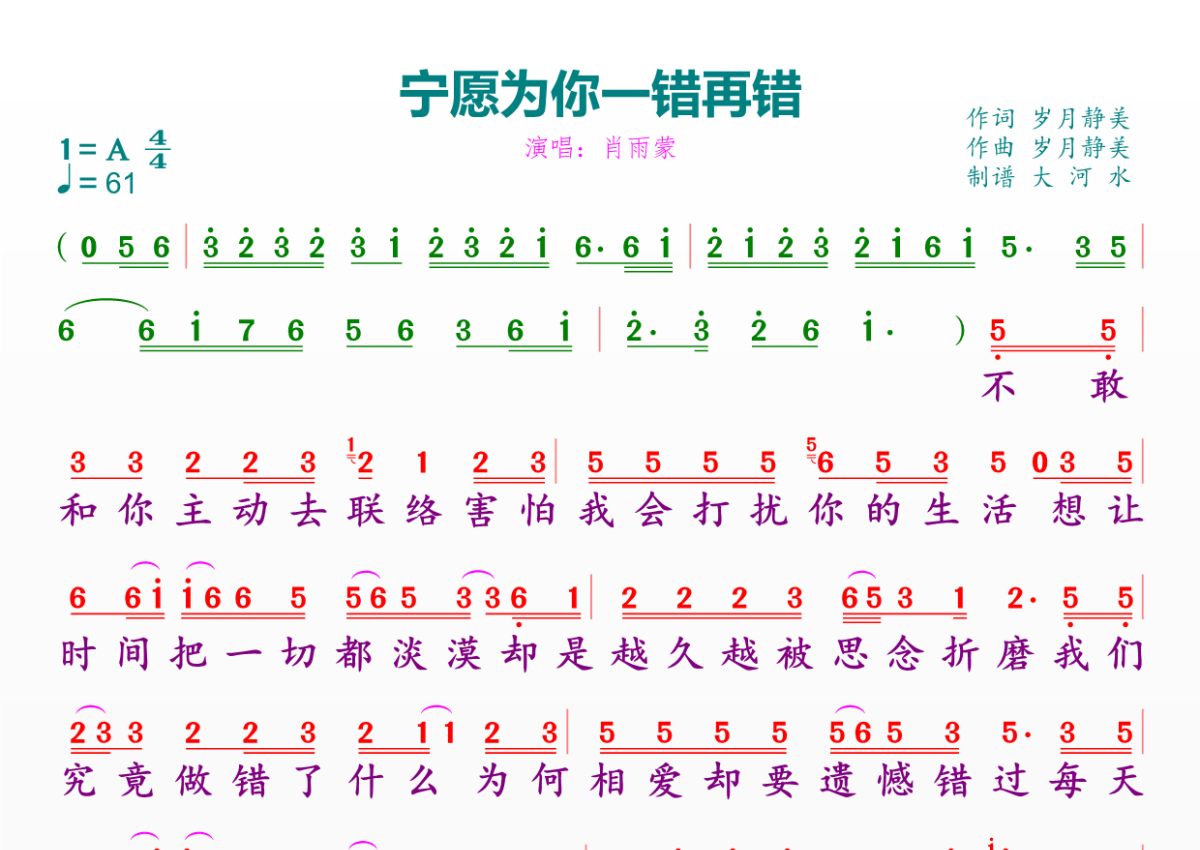 《宁愿为你一错再错》是肖雨濛演唱的一首歌曲,拍号为4/4拍,歌曲速度为每分钟61拍,这份简谱共有一张高清图谱,图谱由 @临海雪原 编配上传。
