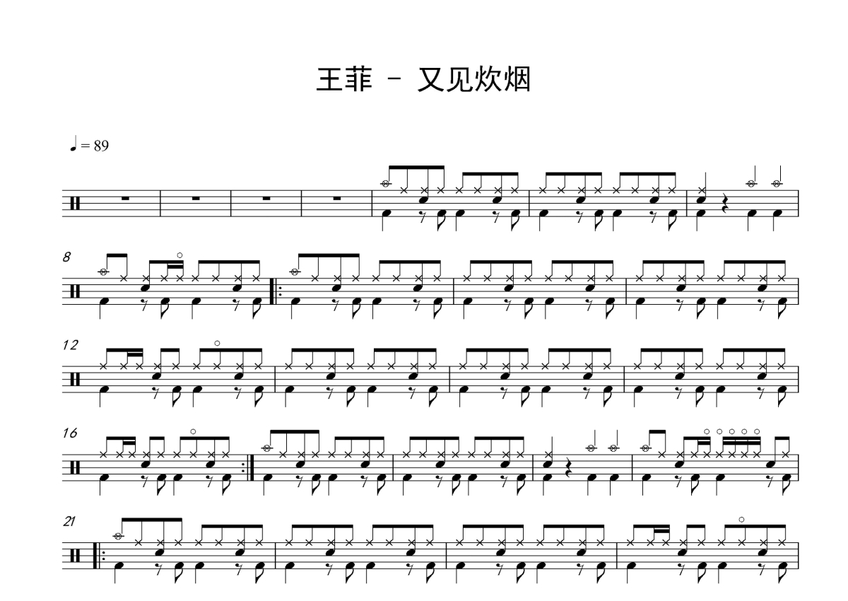 《又见炊烟》是王菲演唱的一首歌曲,拍号为4/4拍,歌曲速度为每分钟89拍,这份架子鼓谱共有一张高清图谱,图谱由 @音符喷血者 编配上传,图谱使用五线谱编配,使用这份又见炊烟架子鼓谱,你将能够轻松地敲打出这首王菲的又见炊烟,快来尝试吧。