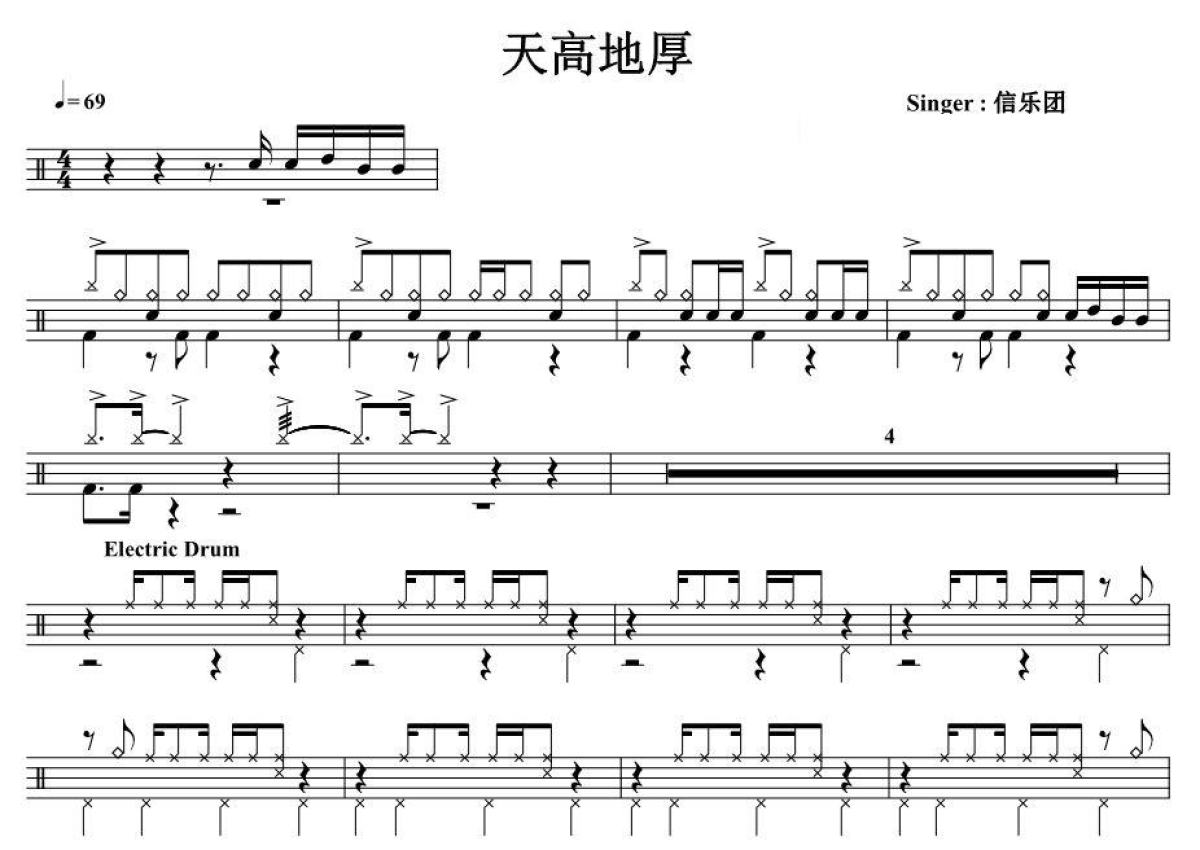 《天高地厚》是信乐团演唱的一首歌曲,拍号为4/4拍,歌曲速度为每分钟69拍,这份架子鼓谱共有两张高清图谱,图谱由 @音符喷血者 编配上传,图谱使用五线谱编配,使用这份天高地厚架子鼓谱,你将能够轻松地敲打出这首信乐团的天高地厚,快来尝试吧。
