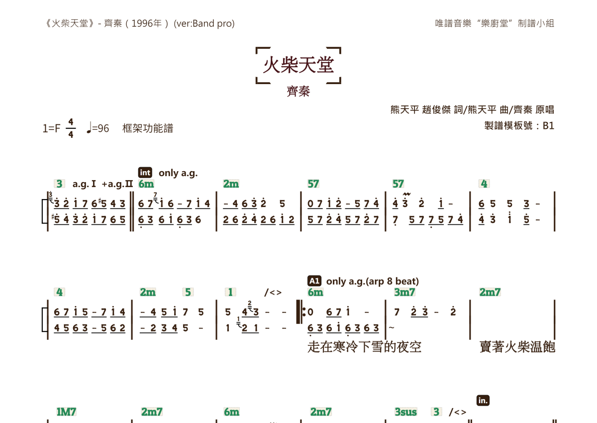《火柴天堂》是齐秦演唱的一首歌曲,框架功能谱,这份乐队总谱共有两张高清图谱,图谱由 @唯谱音乐"乐厨堂"发布小组 编配上传。