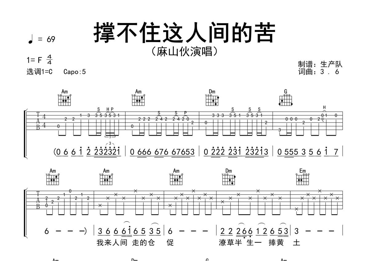 《撑不住这人间的苦》是麻山伙演唱的一首歌曲,精编完美版,拍号为4/4拍,歌曲速度为每分钟69拍,歌曲原调为F调,但由于原调指法比较难,为了方便弹奏,本吉他谱采用的是C调指法编配,变调夹5品弹奏即为原调,当然也可以根据自己的音域改变变调夹位置,或者通过改变和弦调性,以方便自己弹奏,这份吉他谱共有两张高清图谱,图谱由 @生产队 编配上传,图谱使用六线谱编配,包含吉他和弦指法、简谱以及歌词部分,使用这份撑不住这人间的苦吉他谱,可以让你更加方便地掌握这首歌曲的弹唱技巧,快来尝试吧。麻山伙演唱的歌曲《撑不住这人间的苦》原版吉他谱,含进准的前奏、间奏solo编配,精编完美版,优质推荐!。