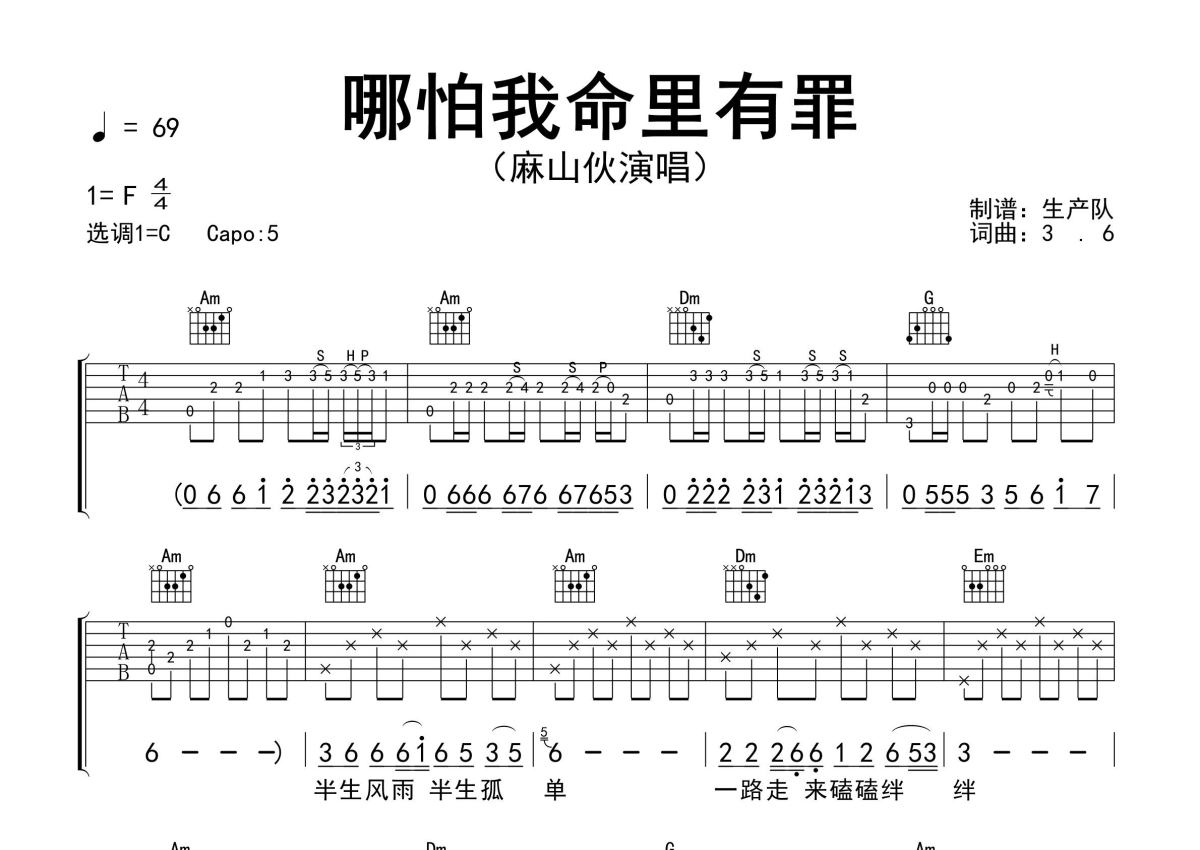 《哪怕我命里有罪》是麻山伙演唱的一首歌曲,精编完美版,拍号为4/4拍,歌曲速度为每分钟69拍,歌曲原调为F调,但由于原调指法比较难,为了方便弹奏,本吉他谱采用的是C调指法编配,变调夹5品弹奏即为原调,当然也可以根据自己的音域改变变调夹位置,或者通过改变和弦调性,以方便自己弹奏,这份吉他谱共有两张高清图谱,图谱由 @生产队 编配上传,图谱使用六线谱编配,包含吉他和弦指法、简谱以及歌词部分,使用这份哪怕我命里有罪吉他谱,可以让你更加方便地掌握这首歌曲的弹唱技巧,快来尝试吧。麻山伙演唱的歌曲《哪怕我命里有罪》原版吉他谱,含进准的前奏、间奏solo编配,精编完美版,优质推荐!。