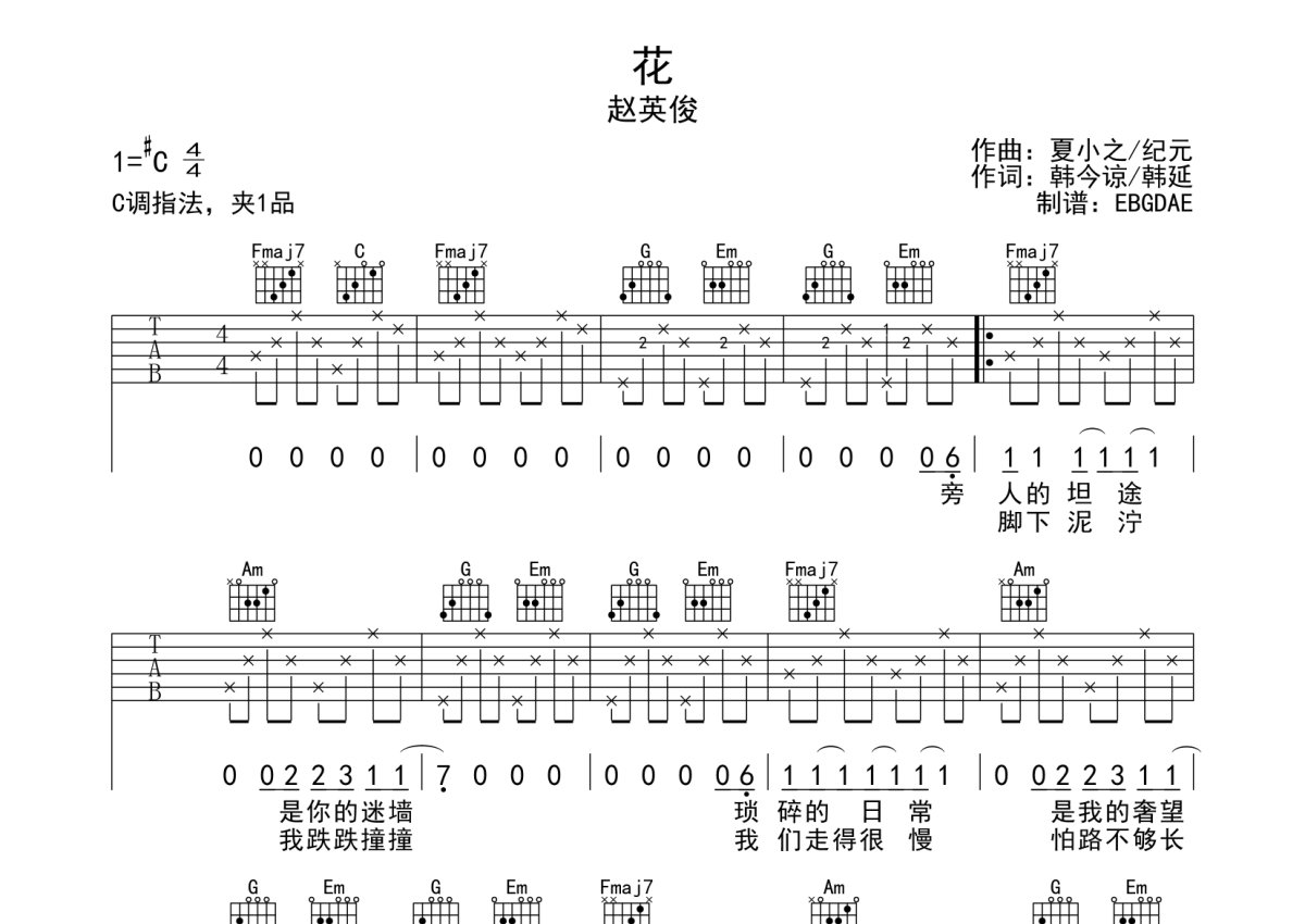 《花》是赵英俊演唱的一首歌曲,本吉他谱采用的是C调指法编配,这份吉他谱共有两张高清图谱,图谱由 @EBGDAE 编配上传,图谱使用六线谱编配,包含吉他和弦指法、简谱以及歌词部分,使用这份花吉他谱,可以让你更加方便地掌握这首歌曲的弹唱技巧,快来尝试吧。2张谱,免翻页排版设计。物美价廉,放心选购!加油!。