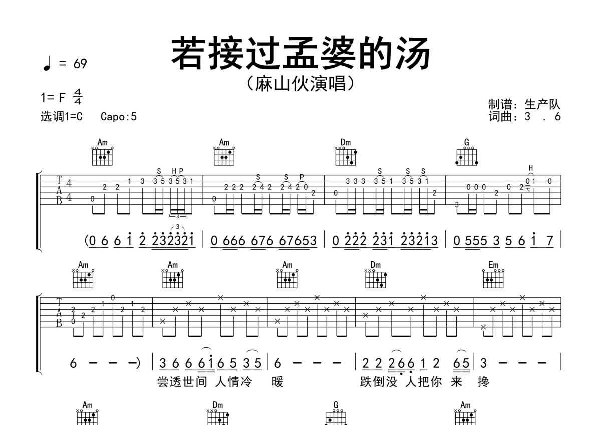《若接过孟婆的汤》是麻山伙演唱的一首歌曲,精编完美版,拍号为4/4拍,歌曲速度为每分钟69拍,歌曲原调为F调,但由于原调指法比较难,为了方便弹奏,本吉他谱采用的是C调指法编配,变调夹5品弹奏即为原调,当然也可以根据自己的音域改变变调夹位置,或者通过改变和弦调性,以方便自己弹奏,这份吉他谱共有两张高清图谱,图谱由 @生产队 编配上传,图谱使用六线谱编配,包含吉他和弦指法、简谱以及歌词部分,使用这份若接过孟婆的汤吉他谱,可以让你更加方便地掌握这首歌曲的弹唱技巧,快来尝试吧。麻山伙演唱的歌曲《若接过孟婆的汤》原版吉他谱,含进准的前奏、间奏solo编配,精编完美版,优质推荐!。