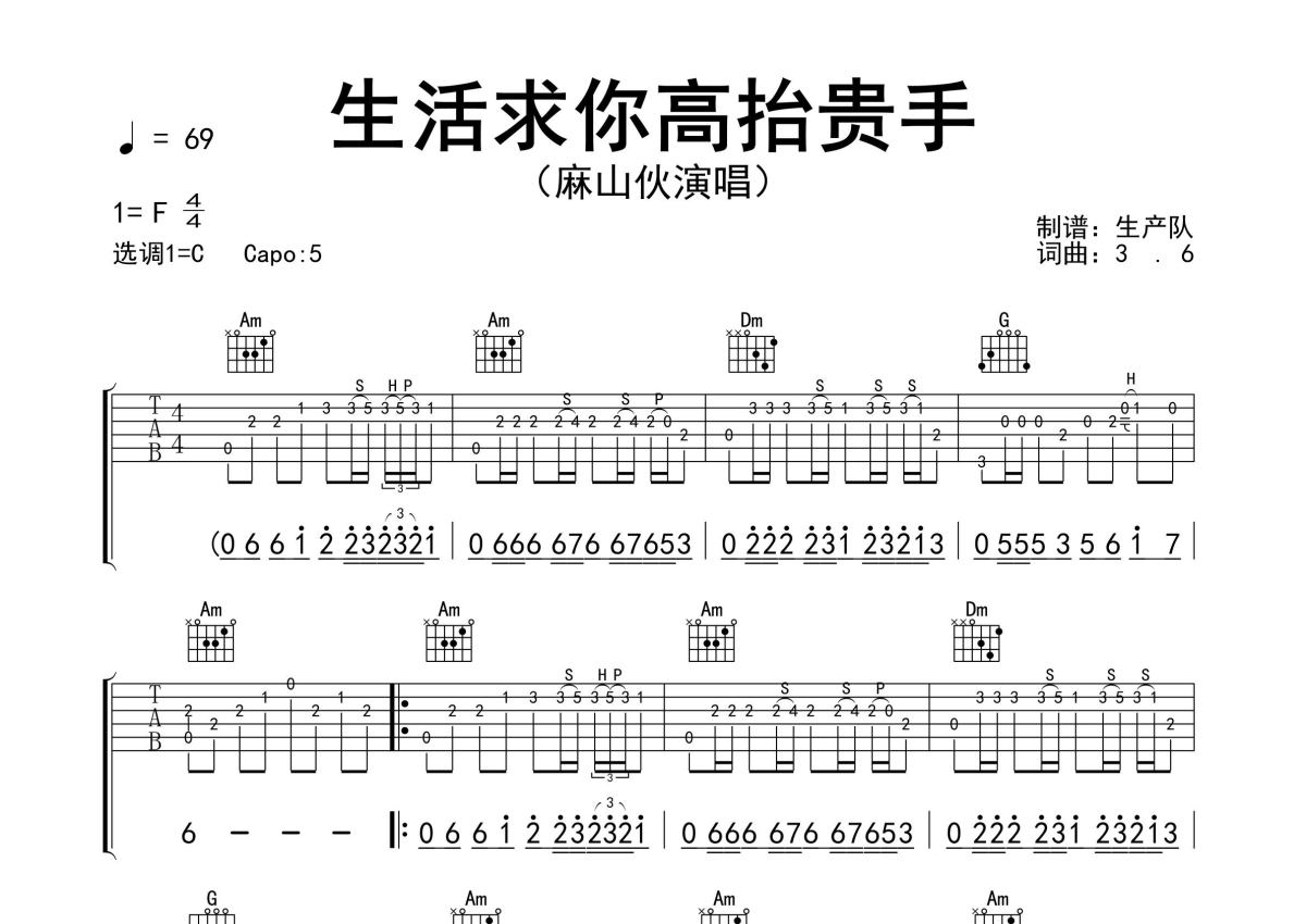 《生活求你高抬贵手》是麻山伙演唱的一首歌曲,精编完美版,拍号为4/4拍,歌曲速度为每分钟69拍,歌曲原调为F调,但由于原调指法比较难,为了方便弹奏,本吉他谱采用的是C调指法编配,变调夹5品弹奏即为原调,当然也可以根据自己的音域改变变调夹位置,或者通过改变和弦调性,以方便自己弹奏,这份吉他谱共有两张高清图谱,图谱由 @生产队 编配上传,图谱使用六线谱编配,包含吉他和弦指法、简谱以及歌词部分,使用这份生活求你高抬贵手吉他谱,可以让你更加方便地掌握这首歌曲的弹唱技巧,快来尝试吧。麻山伙演唱的歌曲《生活求你高抬贵手》原版吉他谱,含进准的前奏、间奏solo编配,精编完美版,优质推荐!。