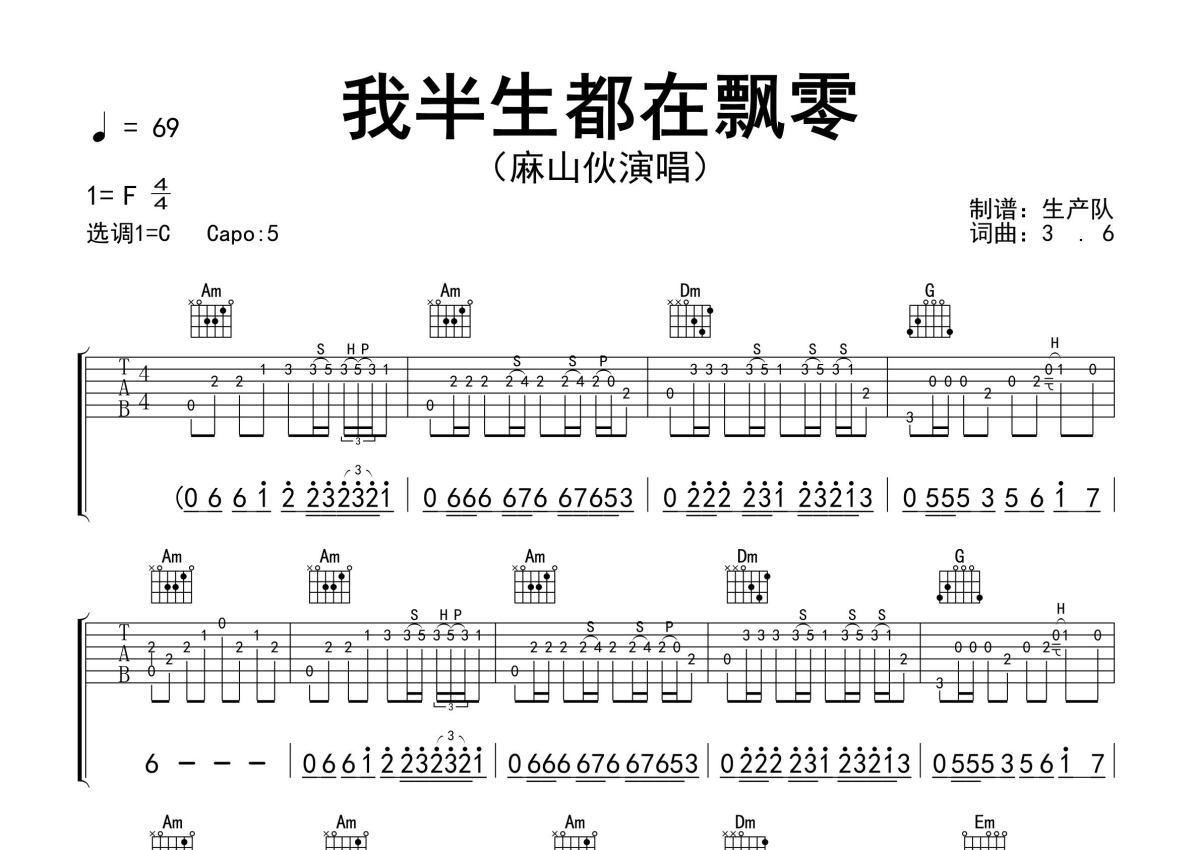 《我半生都在飘零》是麻山伙演唱的一首歌曲,精编完美版,拍号为4/4拍,歌曲速度为每分钟69拍,歌曲原调为F调,但由于原调指法比较难,为了方便弹奏,本吉他谱采用的是C调指法编配,变调夹5品弹奏即为原调,当然也可以根据自己的音域改变变调夹位置,或者通过改变和弦调性,以方便自己弹奏,这份吉他谱共有两张高清图谱,图谱由 @生产队 编配上传,图谱使用六线谱编配,包含吉他和弦指法、简谱以及歌词部分,使用这份我半生都在飘零吉他谱,可以让你更加方便地掌握这首歌曲的弹唱技巧,快来尝试吧。麻山伙演唱的歌曲《我半生都在飘零》原版吉他谱,含进准的前奏、间奏solo编配,精编完美版,优质推荐!。