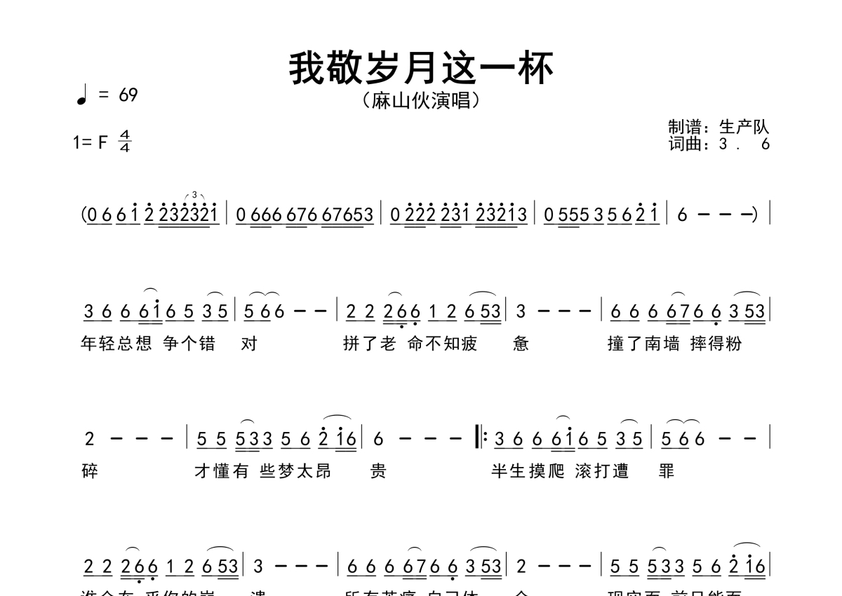《我敬岁月这一杯》是麻山伙演唱的一首歌曲,原版简谱,拍号为4/4拍,歌曲速度为每分钟69拍,这份简谱共有一张高清图谱,图谱由 @生产队 编配上传麻山伙演唱的歌曲《我敬岁月这一杯》原版简谱,含精准的前奏、间奏solo编配,精编完美版,优质推荐!。