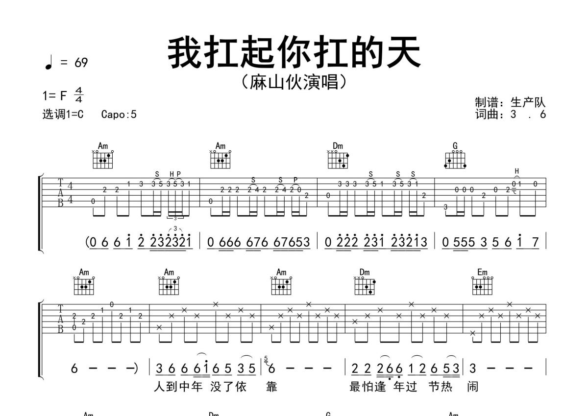 《我扛起你扛的天》是麻山伙演唱的一首歌曲,精编完美版,拍号为4/4拍,歌曲速度为每分钟69拍,歌曲原调为F调,但由于原调指法比较难,为了方便弹奏,本吉他谱采用的是C调指法编配,变调夹5品弹奏即为原调,当然也可以根据自己的音域改变变调夹位置,或者通过改变和弦调性,以方便自己弹奏,这份吉他谱共有两张高清图谱,图谱由 @生产队 编配上传,图谱使用六线谱编配,包含吉他和弦指法、简谱以及歌词部分,使用这份我扛起你扛的天吉他谱,可以让你更加方便地掌握这首歌曲的弹唱技巧,快来尝试吧。麻山伙演唱的歌曲《我扛起你扛的天》原版吉他谱,含精准的前奏、间奏solo编配,精编完美版,优质推荐!。