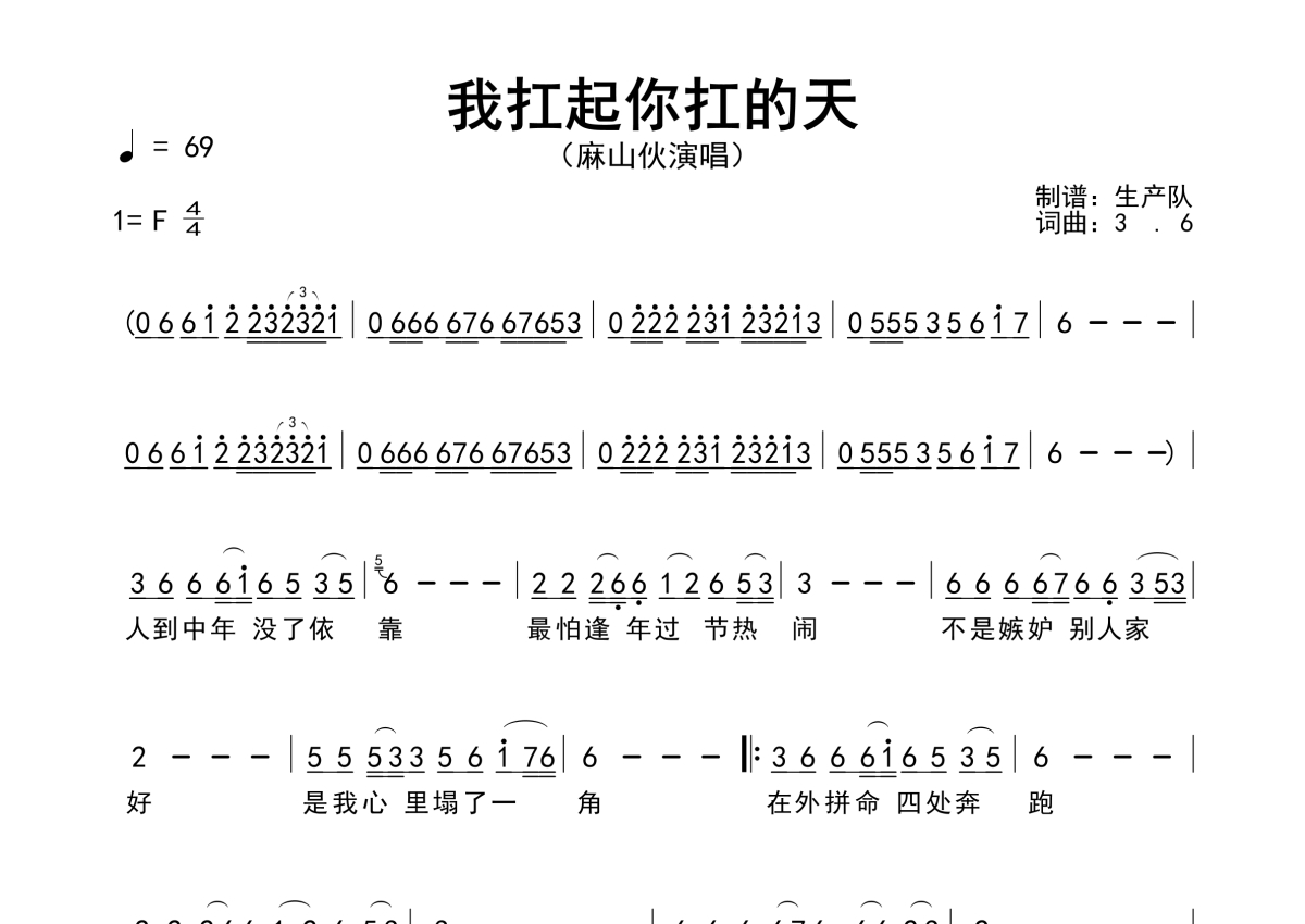 《我扛起你扛的天》是麻山伙演唱的一首歌曲,原版简谱,拍号为4/4拍,歌曲速度为每分钟69拍,这份简谱共有一张高清图谱,图谱由 @生产队 编配上传麻山伙演唱的歌曲《我扛起你扛的天》原版简谱,含精准的前奏、间奏solo编配,精编完美版,优质推荐!。