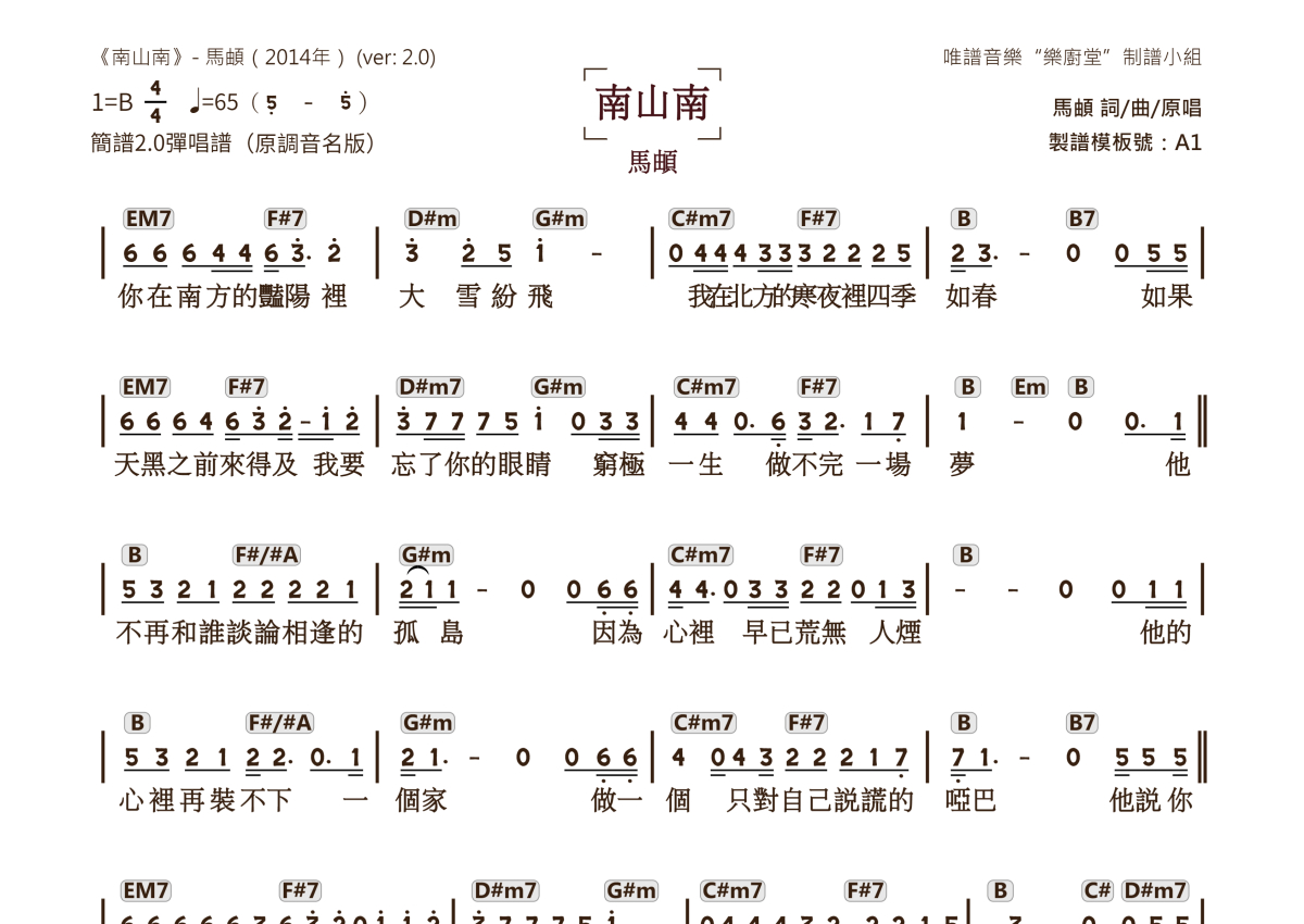 马頔《南山南》简谱 - 简谱2.0弹唱谱音名版
