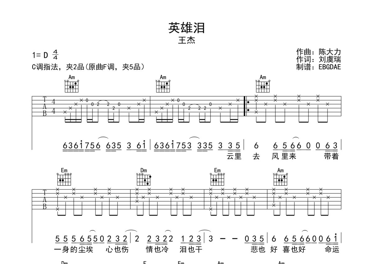《英雄泪》是王杰演唱的一首歌曲,本吉他谱采用的是C调指法编配,这份吉他谱共有两张高清图谱,图谱由 @EBGDAE 编配上传,图谱使用六线谱编配,包含吉他和弦指法、简谱以及歌词部分,使用这份英雄泪吉他谱,可以让你更加方便地掌握这首歌曲的弹唱技巧,快来尝试吧。2张谱,免翻页排版设计。物美价廉,放心选购!加油!。