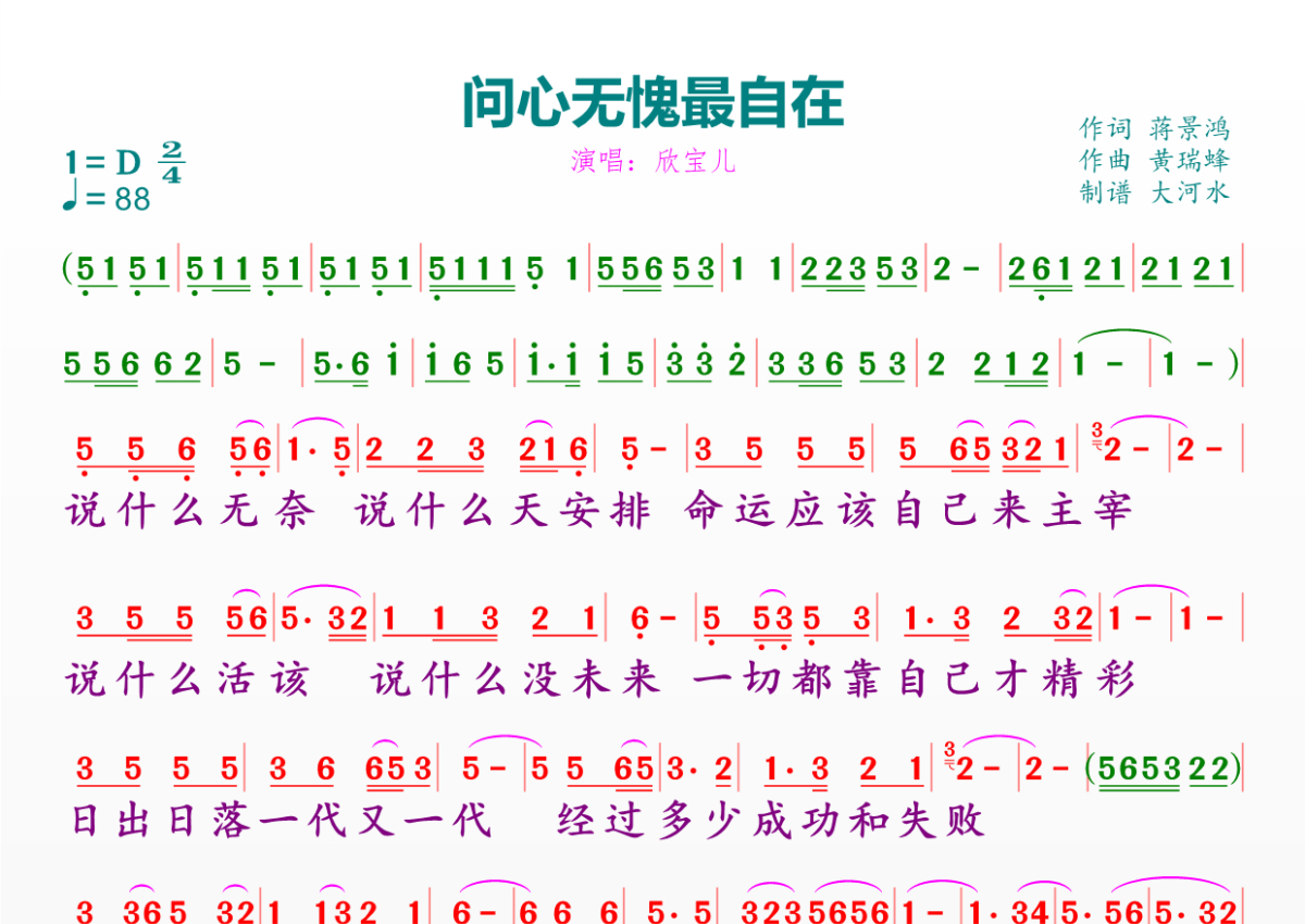 《问心无愧最自在》是欣宝儿演唱的一首歌曲,拍号为2/4拍,歌曲速度为每分钟88拍,这份简谱共有一张高清图谱,图谱由 @临海雪原 编配上传。