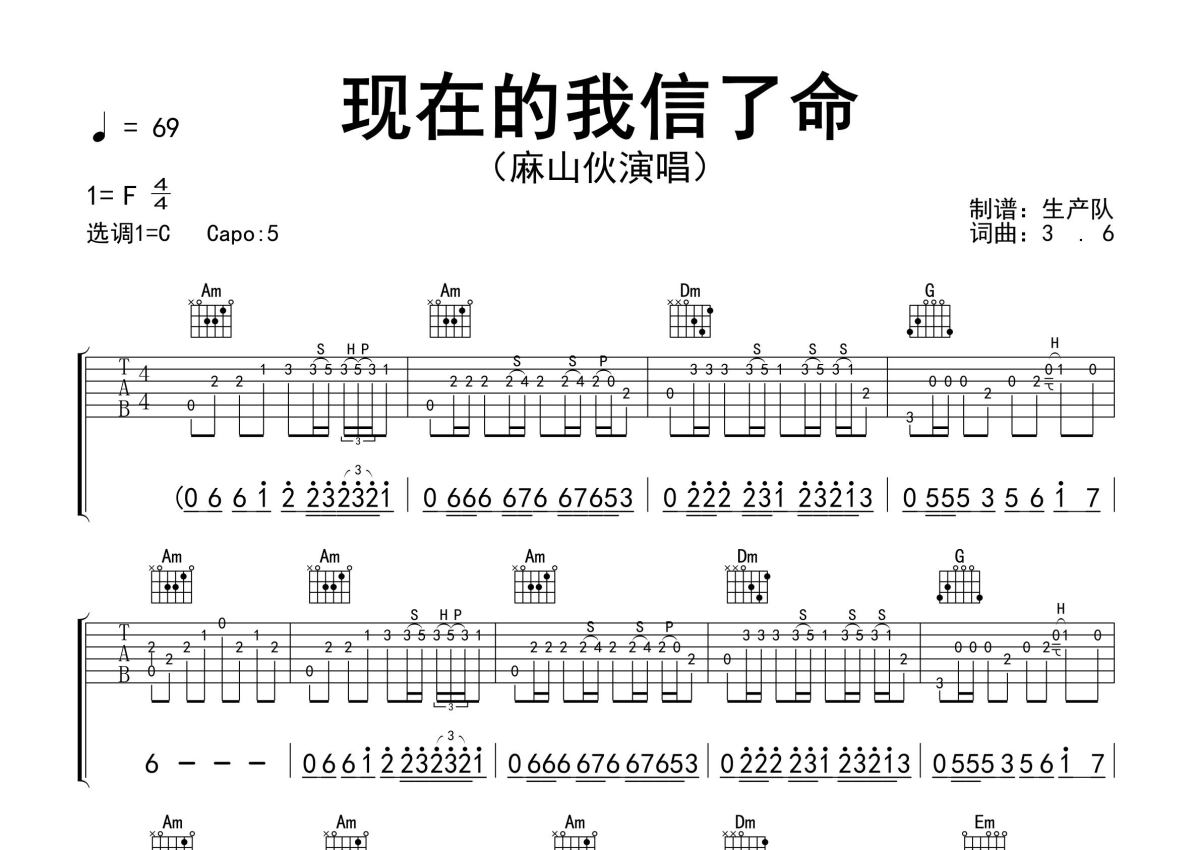 《现在的我信了命》是麻山伙演唱的一首歌曲,精编完美版,拍号为4/4拍,歌曲速度为每分钟69拍,歌曲原调为F调,但由于原调指法比较难,为了方便弹奏,本吉他谱采用的是C调指法编配,变调夹5品弹奏即为原调,当然也可以根据自己的音域改变变调夹位置,或者通过改变和弦调性,以方便自己弹奏,这份吉他谱共有两张高清图谱,图谱由 @生产队 编配上传,图谱使用六线谱编配,包含吉他和弦指法、简谱以及歌词部分,使用这份现在的我信了命吉他谱,可以让你更加方便地掌握这首歌曲的弹唱技巧,快来尝试吧。麻山伙演唱的歌曲《现在的我信了命》原版吉他谱,含精准的前奏、间奏solo编配,精编完美版,优质推荐!。