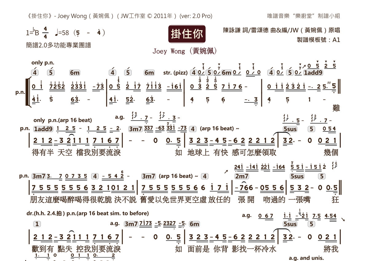 《挂住你》是JW演唱的一首歌曲,2.0版多功能团谱,这份乐队总谱共有两张高清图谱,图谱由 @唯谱音乐"乐厨堂"发布小组 编配上传。