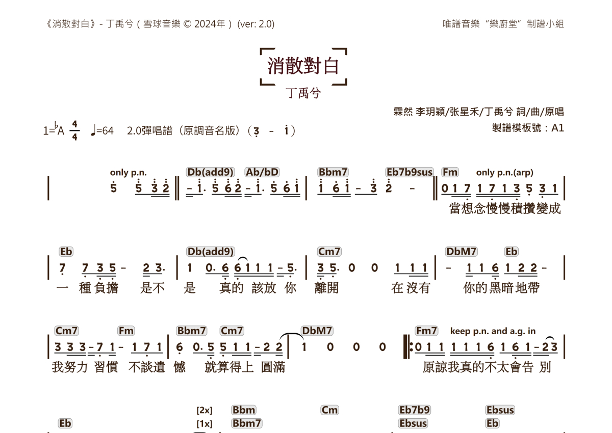 《消散对白》是丁禹兮演唱的一首歌曲,简谱2.0弹唱谱音名版,这份简谱共有两张高清图谱,图谱由 @唯谱音乐"乐厨堂"发布小组 编配上传。