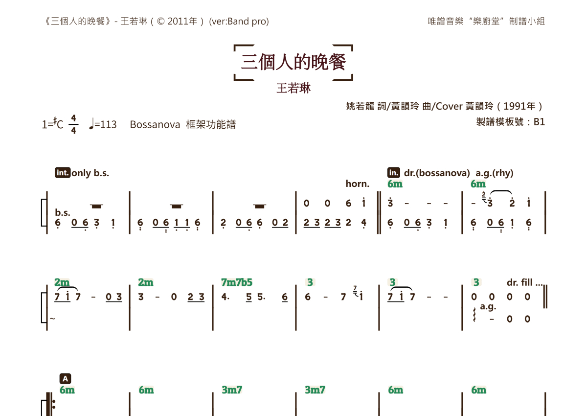 “乐厨堂”乐谱发布小组: 出版级乐谱扒谱制谱——以职业乐手圈通行标准记谱,遵循原版和声、伴奏元素和段落结构。 ❶ 2.0多功能专业团谱:采用台湾卓著公司开创的二代简谱标准制作。二代简谱无疑是迄今为止最科学、最易读的专业范畴多功能记谱方案:❷ 框架谱:采用职业乐手通常记谱方案制作。