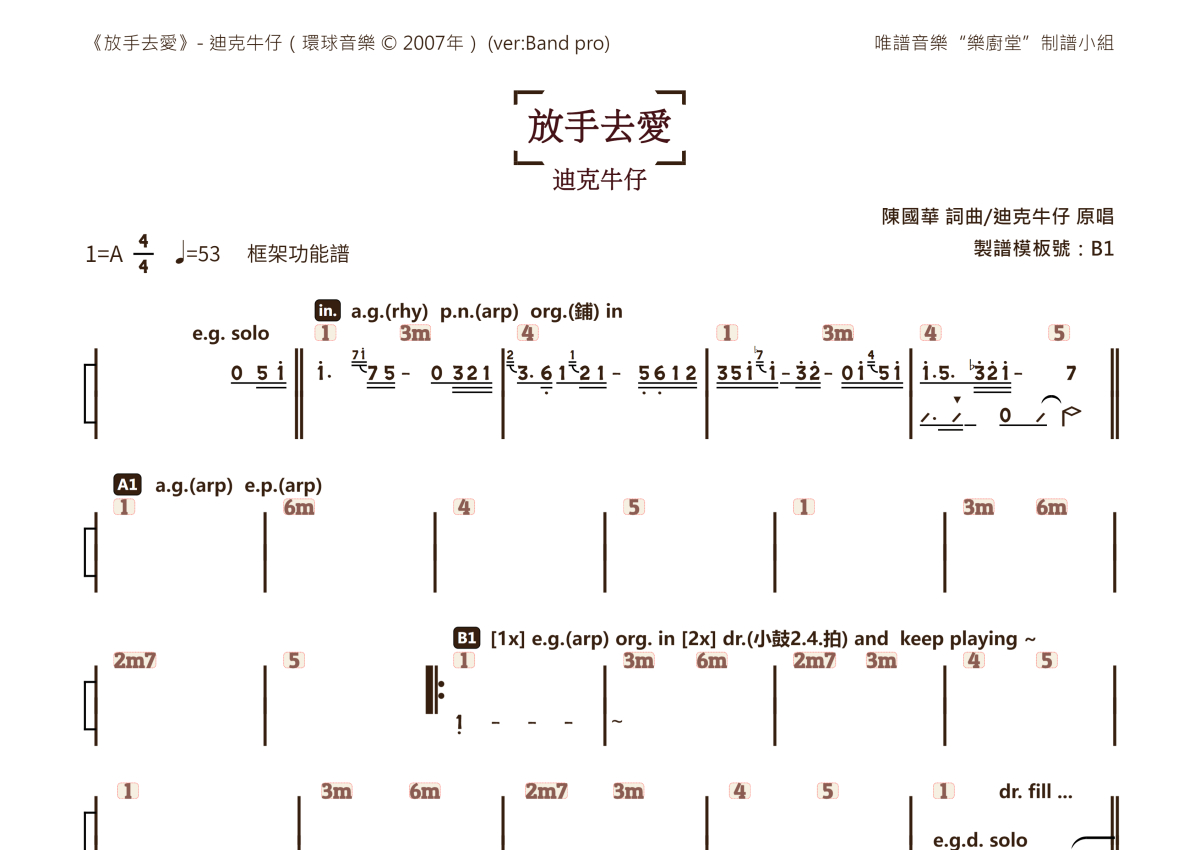 《放手去爱》是迪克牛仔演唱的一首歌曲,框架功能谱,这份乐队总谱共有一张高清图谱,图谱由 @唯谱音乐"乐厨堂"发布小组 编配上传。