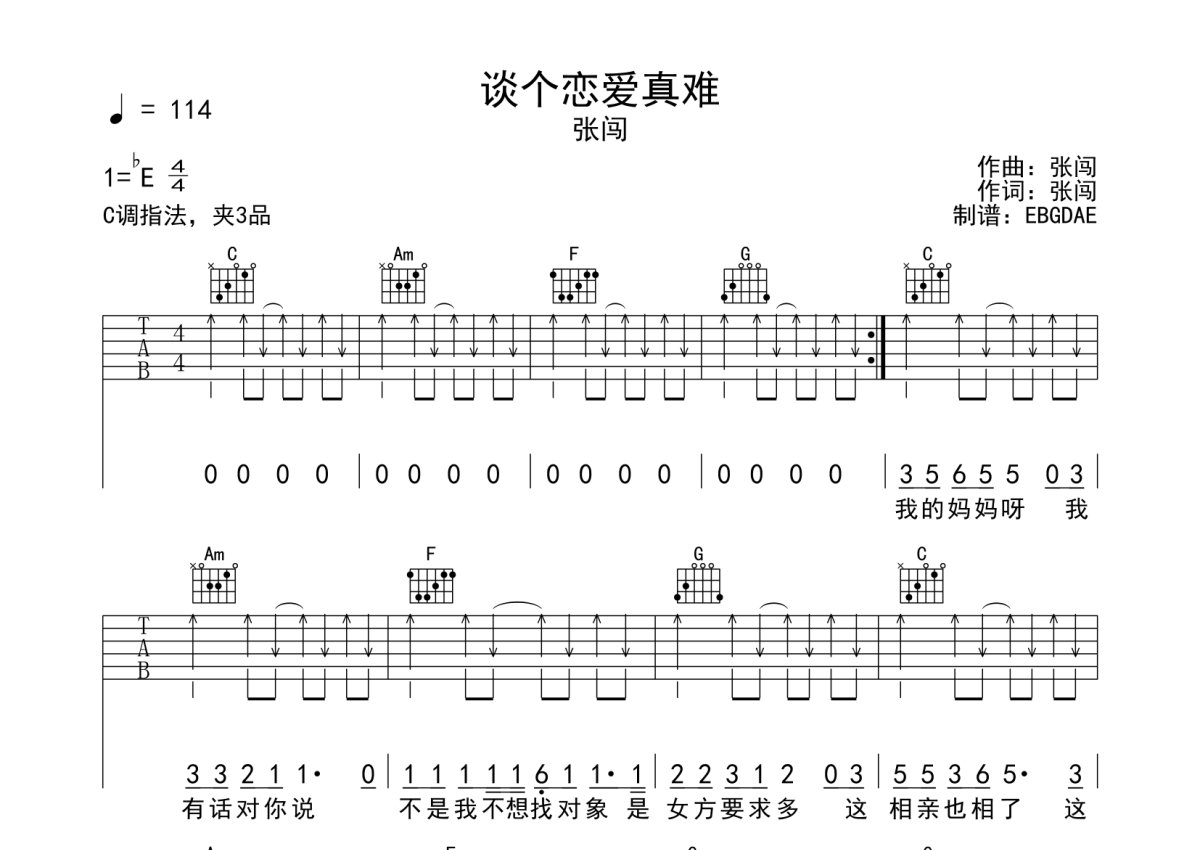 张闯《谈个恋爱真难》吉他谱 - C调弹唱六线谱