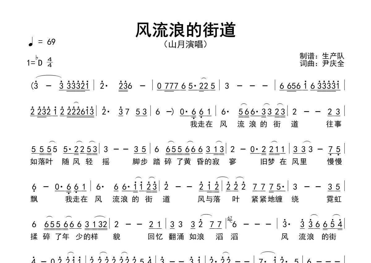 《风流浪的街道》是山月演唱的一首歌曲,原版简谱,拍号为4/4拍,歌曲速度为每分钟69拍,这份简谱共有一张高清图谱,图谱由 @生产队 编配上传山月演唱的歌曲《风流浪的街道》原版简谱,含精准的前奏solo编配,精编完美版,优质推荐!。