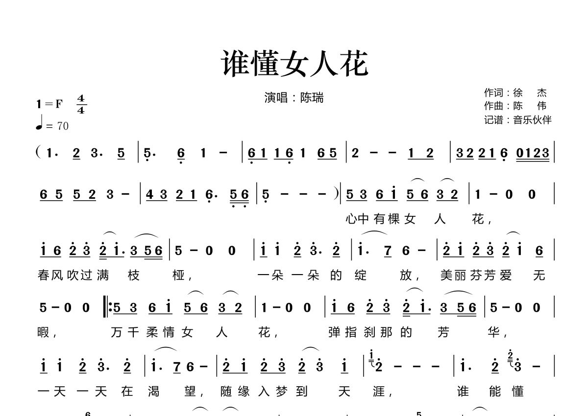 《谁懂女人花》是陈瑞演唱的一首歌曲,拍号为4/4拍,歌曲速度为每分钟70拍,这份简谱共有一张高清图谱,图谱由 @音乐伙伴 编配上传。