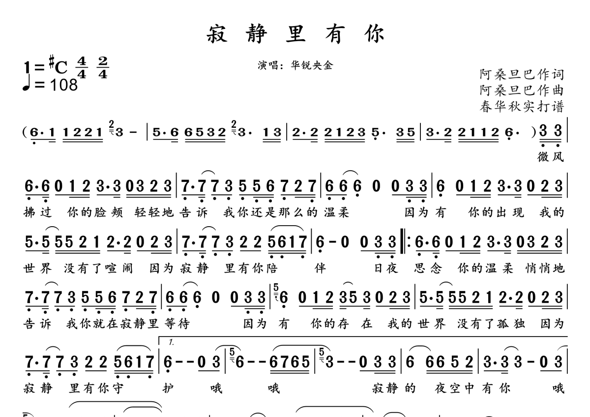 《寂静里有你》是华锐央金演唱的一首歌曲,拍号为4/4拍,歌曲速度为每分钟108拍,这份简谱共有一张高清图谱,图谱由 @春华秋实 编配上传。