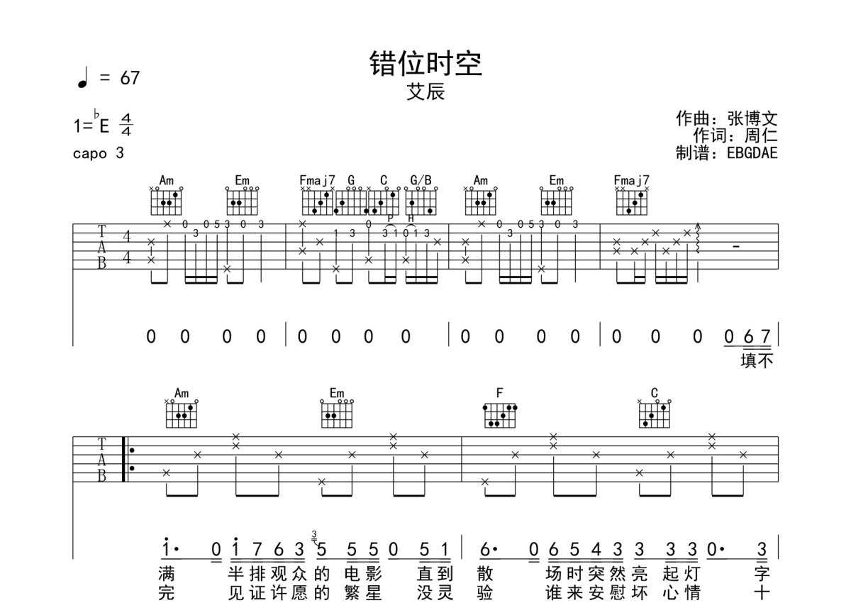 艾辰《错位时空》吉他谱 - C调弹唱六线谱