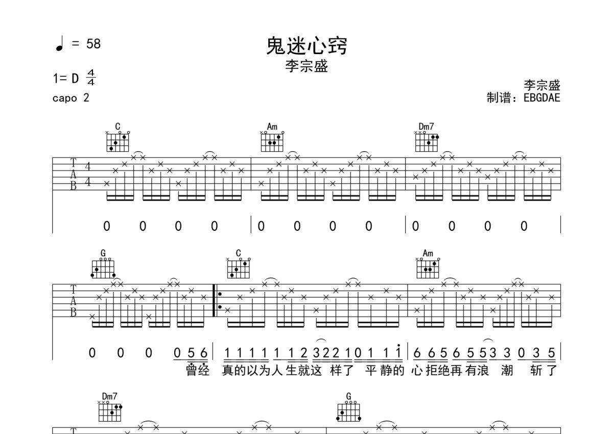 《鬼迷心窍》是李宗盛演唱的一首歌曲,本吉他谱采用的是C调指法编配,这份吉他谱共有两张高清图谱,图谱由 @EBGDAE 编配上传,图谱使用六线谱编配,包含吉他和弦指法、简谱以及歌词部分,使用这份鬼迷心窍吉他谱,可以让你更加方便地掌握这首歌曲的弹唱技巧,快来尝试吧。2张谱,免翻页排版设计。物美价廉,放心选购!加油!。