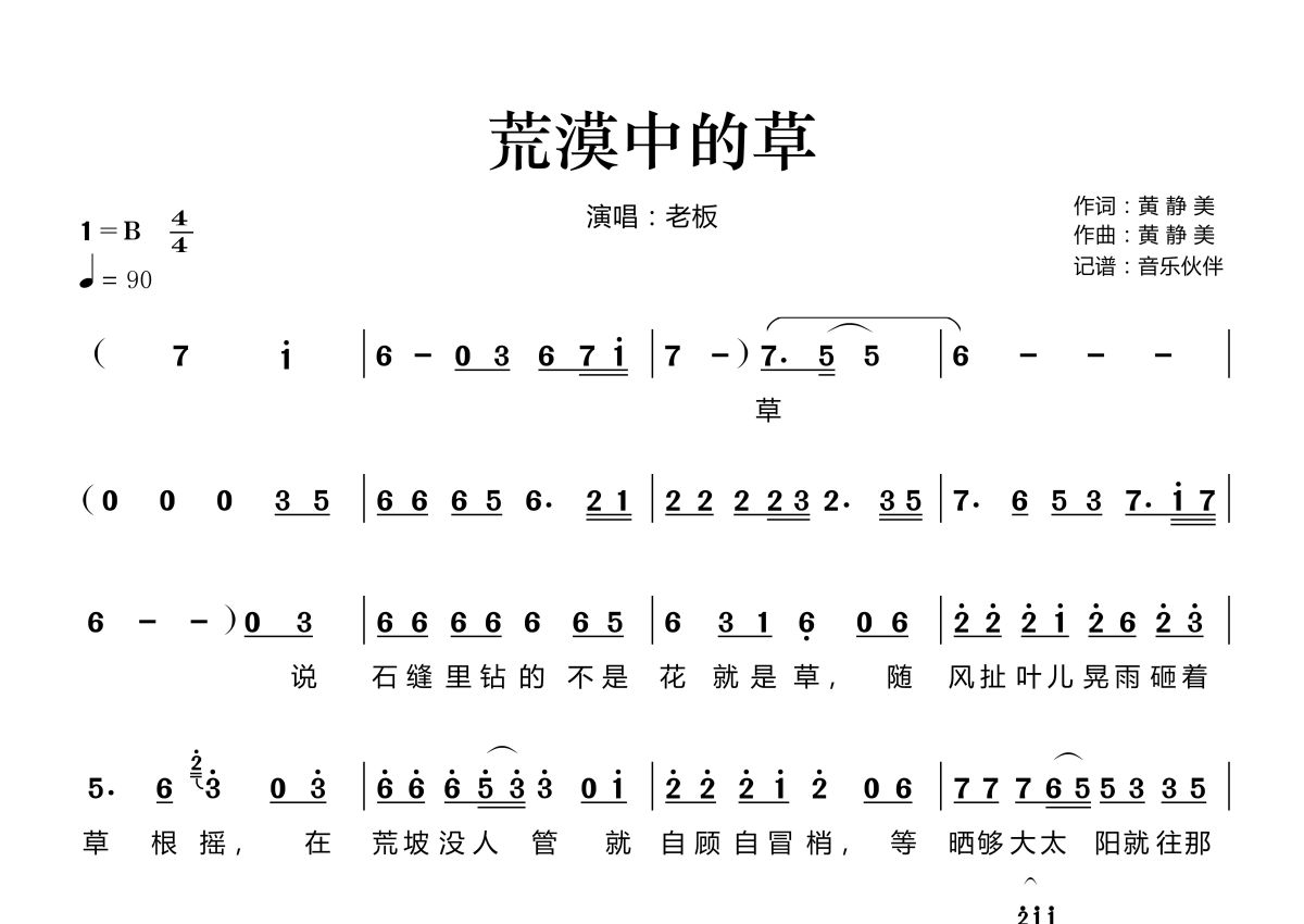 《荒漠中的草》是老板演唱的一首歌曲,拍号为4/4拍,歌曲速度为每分钟90拍,这份简谱共有两张高清图谱,图谱由 @音乐伙伴 编配上传。