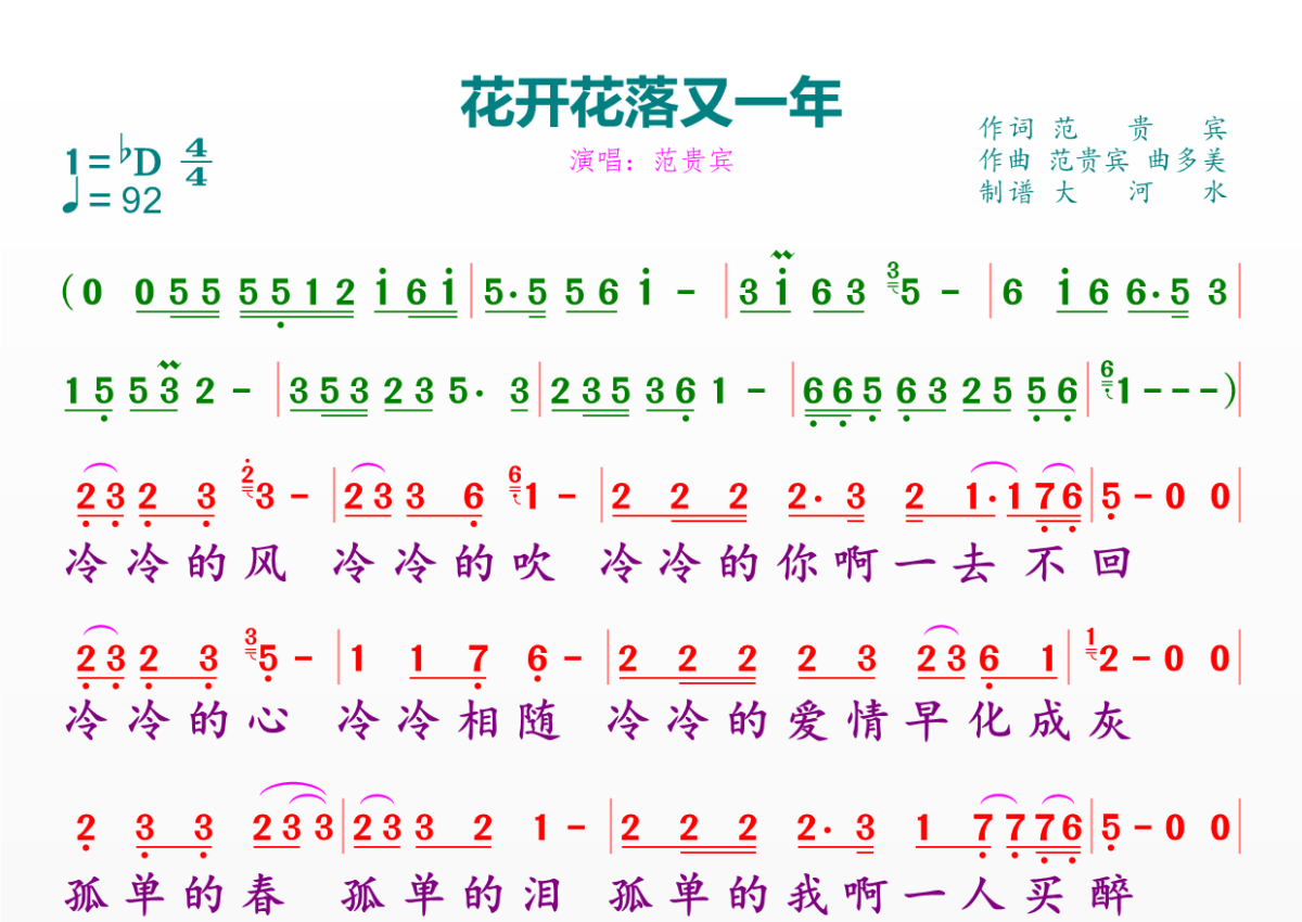 《花开花落又一年》是范贵宾演唱的一首歌曲,拍号为4/4拍,歌曲速度为每分钟92拍,这份简谱共有一张高清图谱,图谱由 @临海雪原 编配上传。
