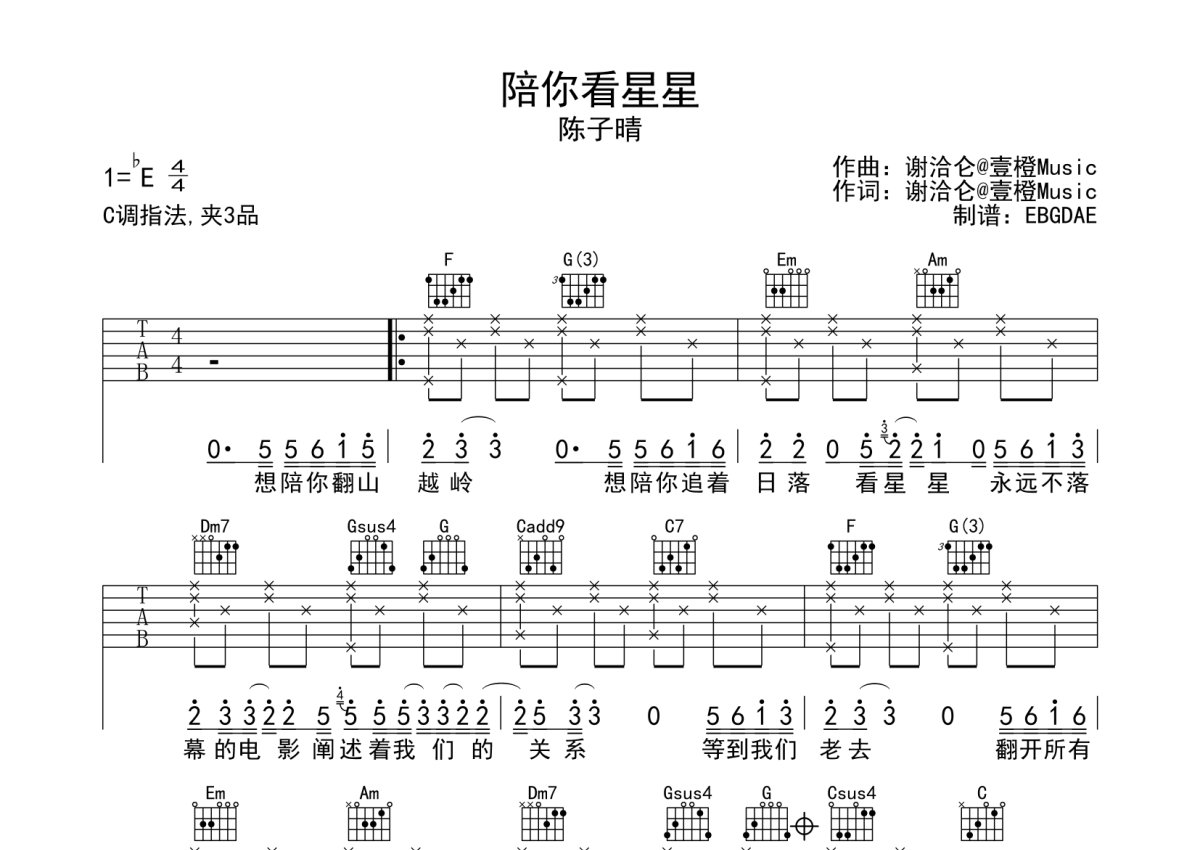《陪你看星星》是陈子晴演唱的一首歌曲,本吉他谱采用的是C调指法编配,这份吉他谱共有三张高清图谱,图谱由 @EBGDAE 编配上传,图谱使用六线谱编配,包含吉他和弦指法、简谱以及歌词部分,使用这份陪你看星星吉他谱,可以让你更加方便地掌握这首歌曲的弹唱技巧,快来尝试吧。原版编配,物美价廉,放心选购!加油!。