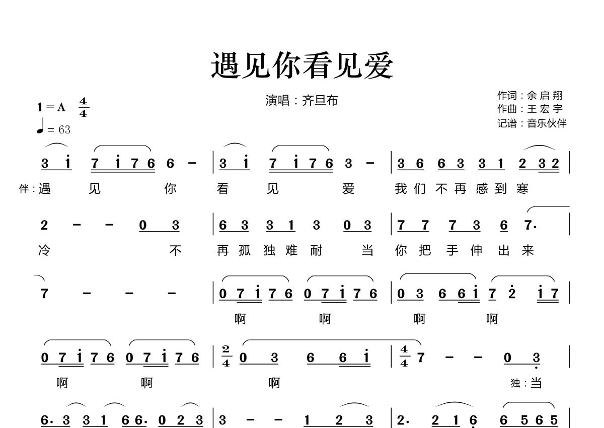 《遇见你看见爱》是齐旦布演唱的一首歌曲,拍号为4/4拍,歌曲速度为每分钟63拍,这份简谱共有两张高清图谱,图谱由 @音乐伙伴 编配上传。