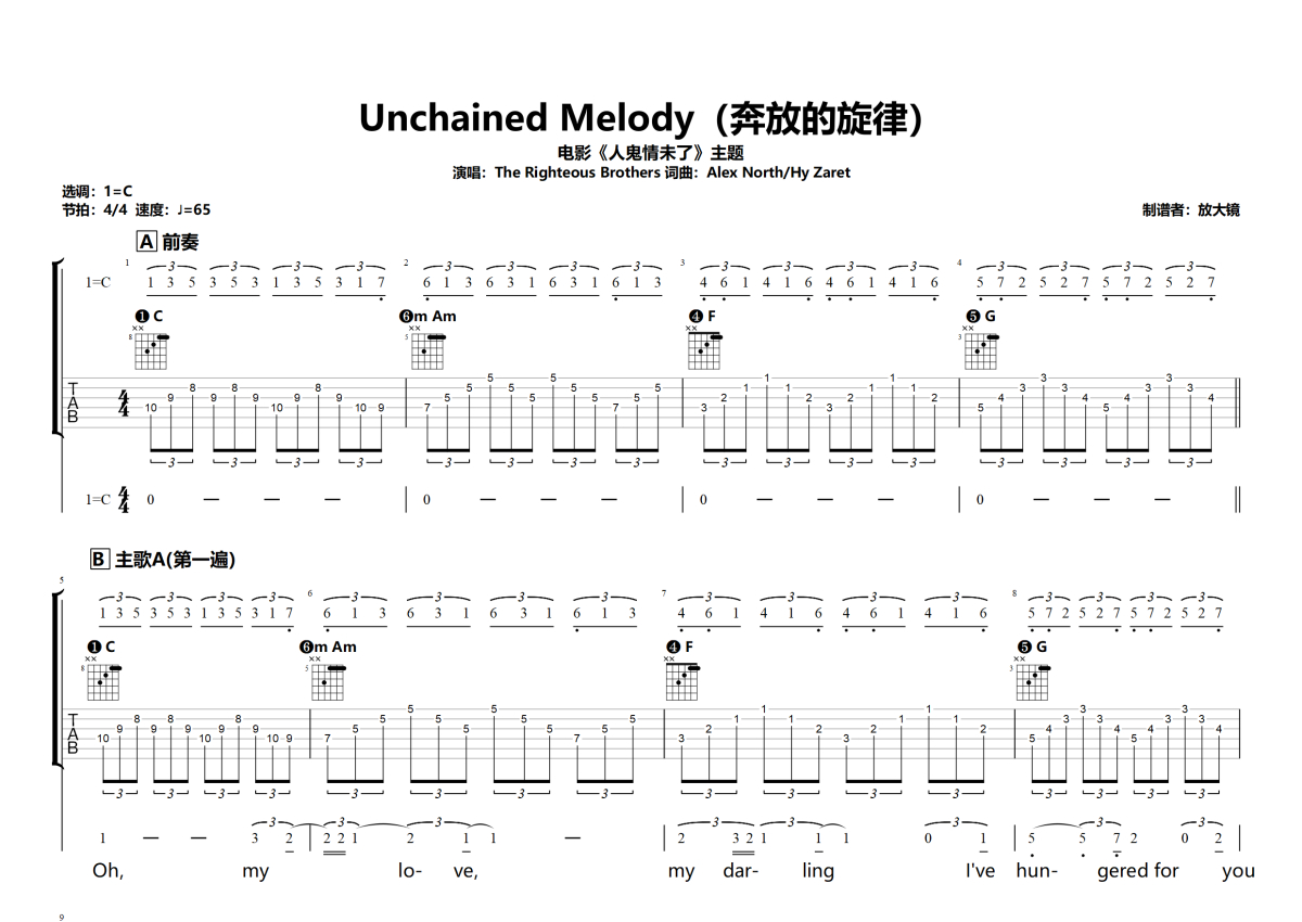 《Unchained Melody(奔放的旋律)》是奔放的旋律演唱的一首歌曲,弹唱,拍号为4/4拍,歌曲速度为每分钟65拍,歌曲原调为C调,本吉他谱采用的是C调指法编配,演奏时不需要使用变调夹即为原调,这份吉他谱共有四张高清图谱,图谱由 @微信用户 编配上传,图谱使用六线谱编配,包含吉他和弦指法、简谱以及歌词部分,曲谱配备了相关的音频提供试听,使用这份Unchained Melody(奔放的旋律)吉他谱,可以让你更加方便地掌握这首歌曲的弹唱技巧,快来尝试吧。《Unchained Melody(奔放的旋律)》本是 1955 年的监狱主题老歌,因 1990 年电影《人鬼情未了》的经典场景,化身跨越生死的爱情圣歌,以悠长旋律与深情呐喊,成为全球公认的不朽金曲。本谱为C调。全部的和弦分布在高音4根弦上。通过高低把位切换。将原曲的钢琴配器改变为吉他编配。