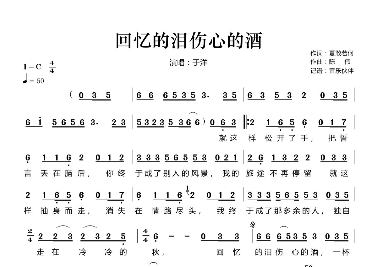 《回忆的泪伤心的酒》是于洋演唱的一首歌曲,拍号为4/4拍,歌曲速度为每分钟60拍,这份简谱共有一张高清图谱,图谱由 @音乐伙伴 编配上传。