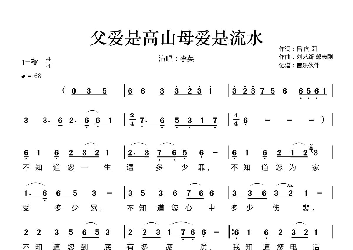 《父爱是高山母爱是流水》是李英演唱的一首歌曲,拍号为4/4拍,歌曲速度为每分钟68拍,这份简谱共有两张高清图谱,图谱由 @音乐伙伴 编配上传。