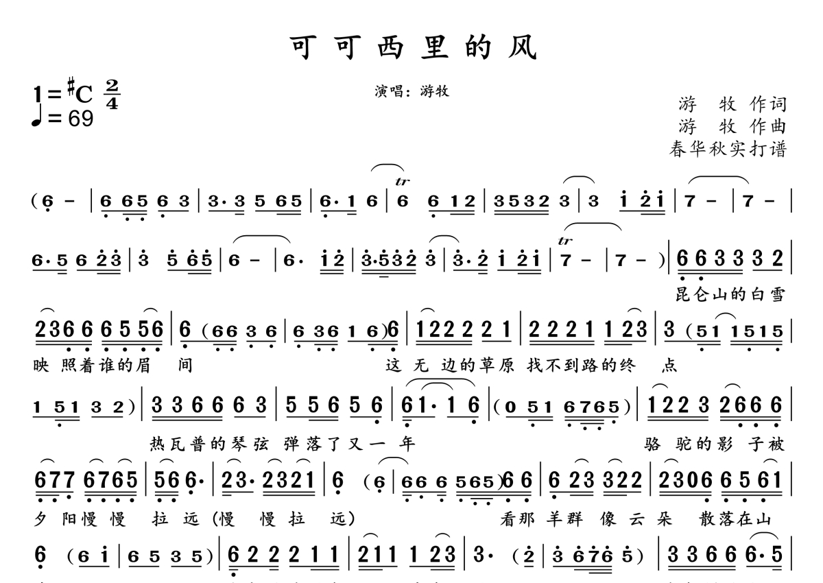 《可可西里的风》是游牧演唱的一首歌曲,拍号为2/4拍,这份简谱共有两张高清图谱,图谱由 @春华秋实 编配上传。