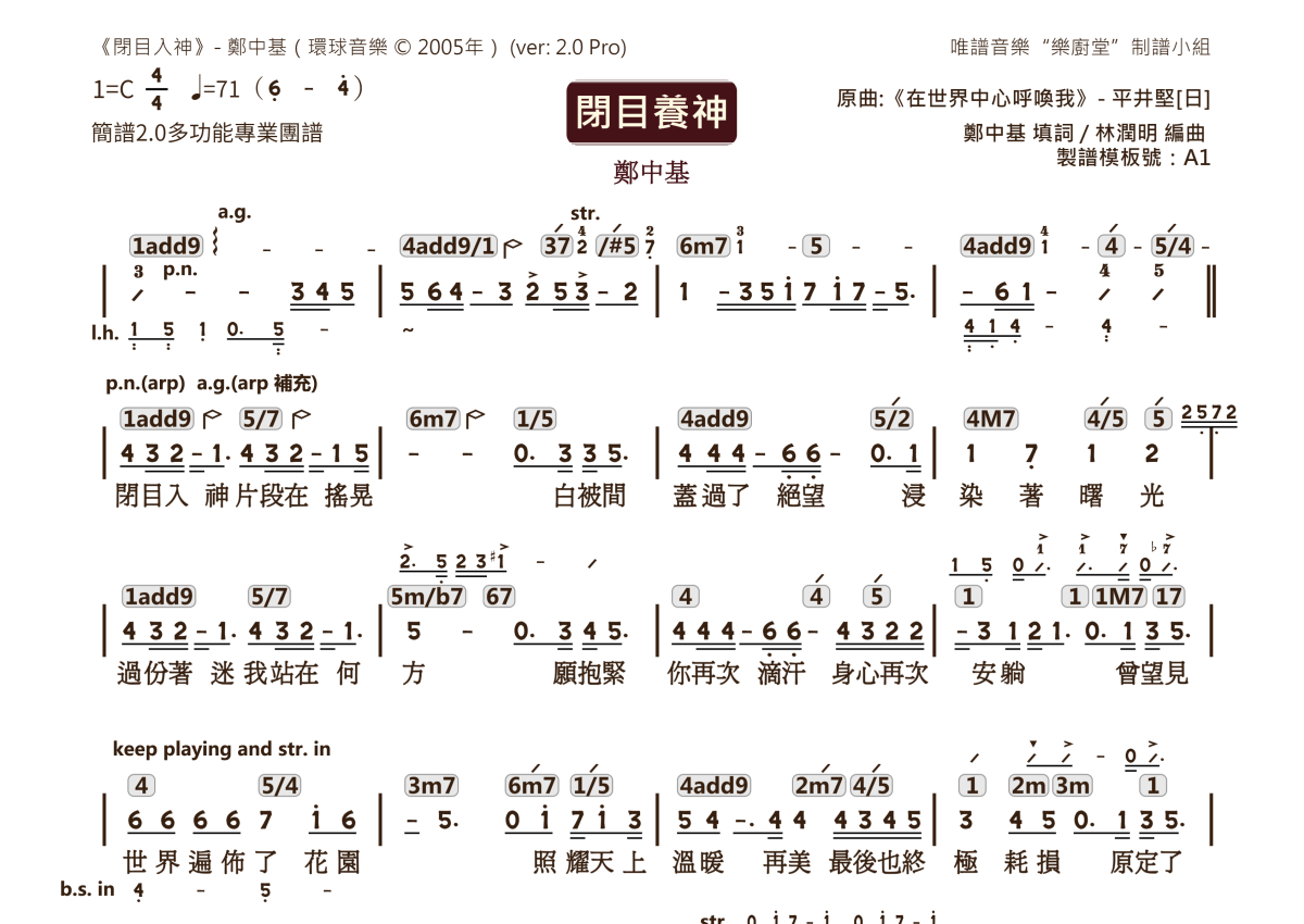 闭目养神乐队总谱 - 郑中基演唱 - 2.0版多功能团谱