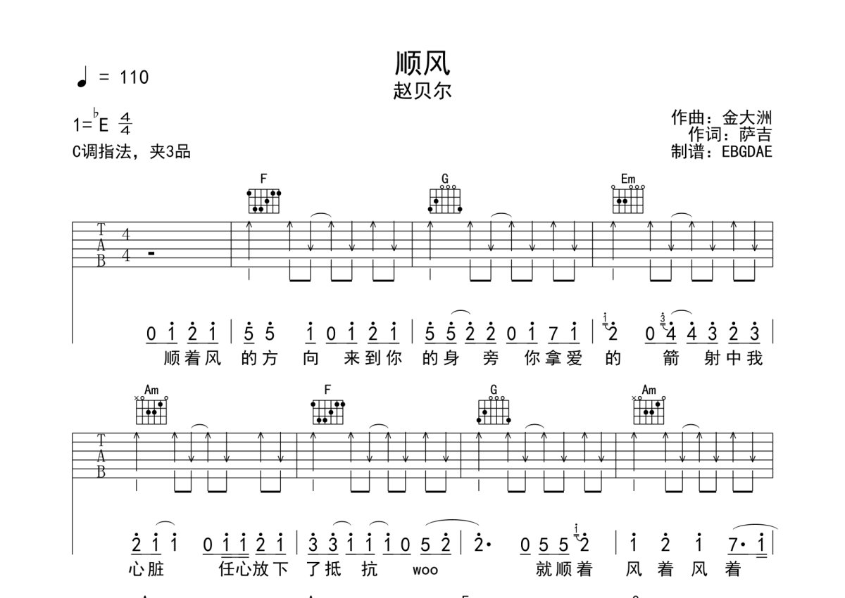 赵贝尔《顺风》吉他谱 - C调弹唱六线谱