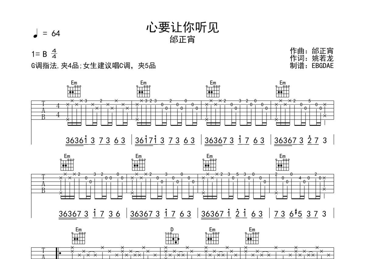 《心要让你听见》是邰正宵演唱的一首歌曲,本吉他谱采用的是G调指法编配,这份吉他谱共有两张高清图谱,图谱由 @EBGDAE 编配上传,图谱使用六线谱编配,包含吉他和弦指法、简谱以及歌词部分,使用这份心要让你听见吉他谱,可以让你更加方便地掌握这首歌曲的弹唱技巧,快来尝试吧。2张谱,免翻页排版设计。物美价廉,放心选购!加油!。