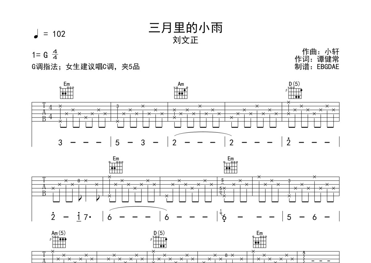 刘文正《三月里的小雨》吉他谱 - G调弹唱六线谱