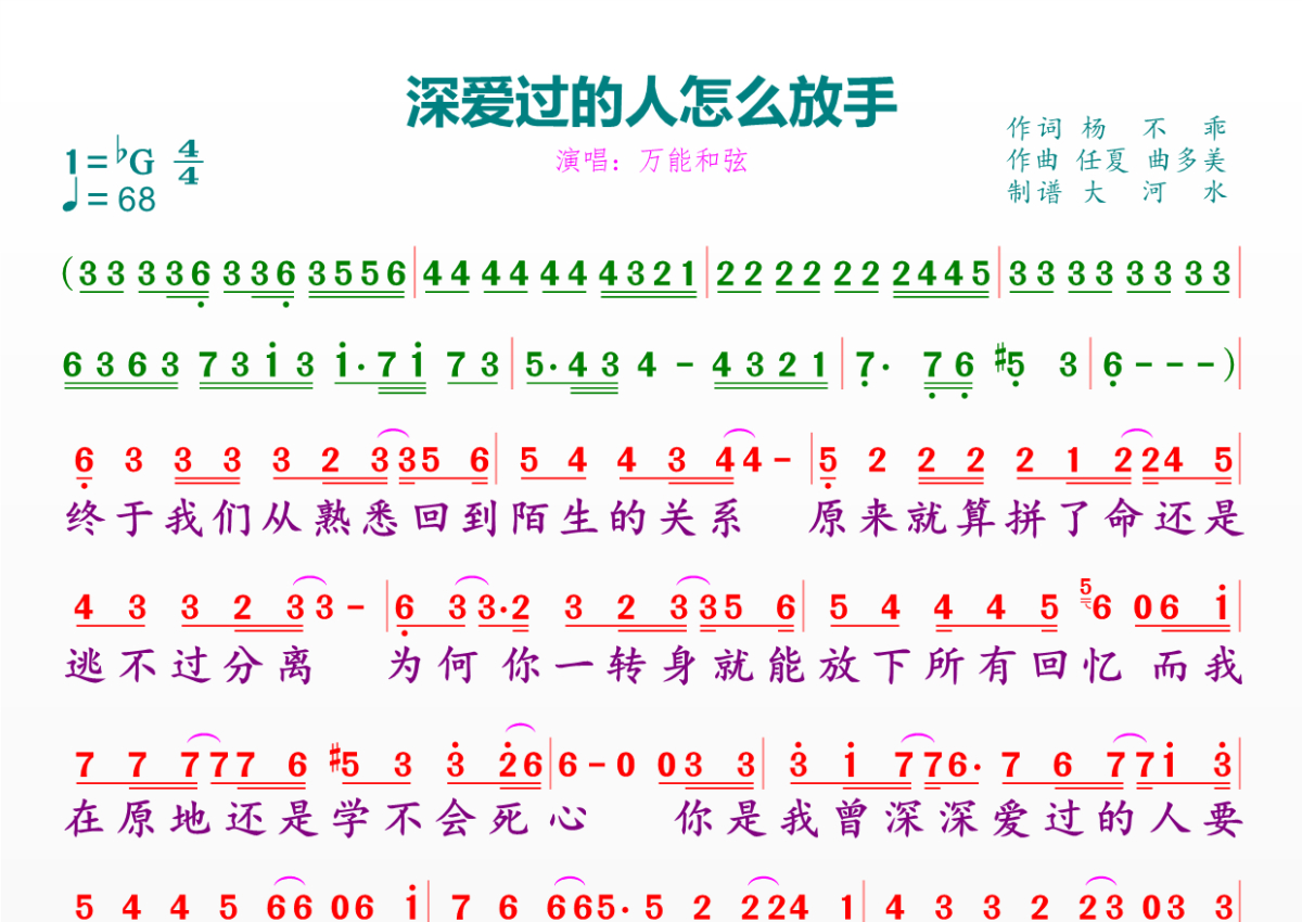 《深爱过的人怎么放手》是万能和弦演唱的一首歌曲,拍号为4/4拍,歌曲速度为每分钟68拍,这份简谱共有一张高清图谱,图谱由 @临海雪原 编配上传。