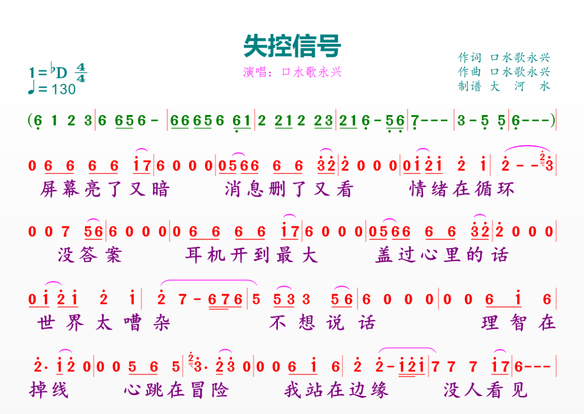 《失控信号》是口水歌永兴演唱的一首歌曲,拍号为4/4拍,歌曲速度为每分钟130拍,这份简谱共有一张高清图谱,图谱由 @临海雪原 编配上传。