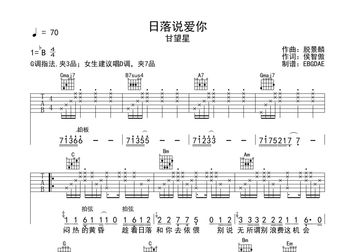 甘望星《日落说爱你》吉他谱 - G调弹唱六线谱