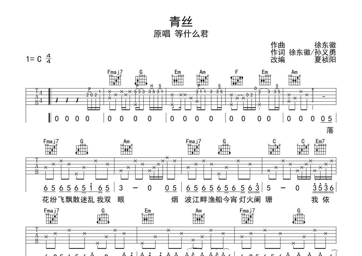 等什么君《青丝》吉他谱 - C调弹唱六线谱