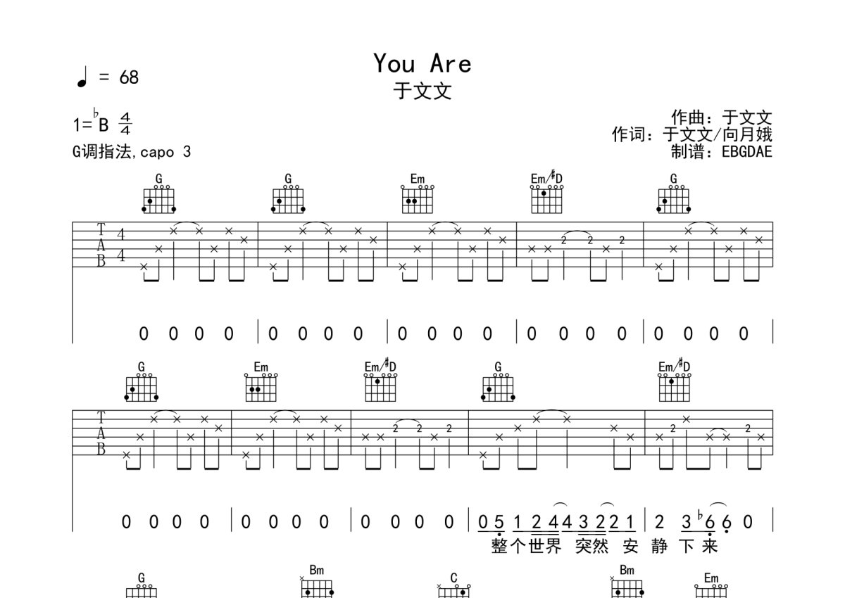 于文文《You Are》吉他谱 - G调弹唱六线谱