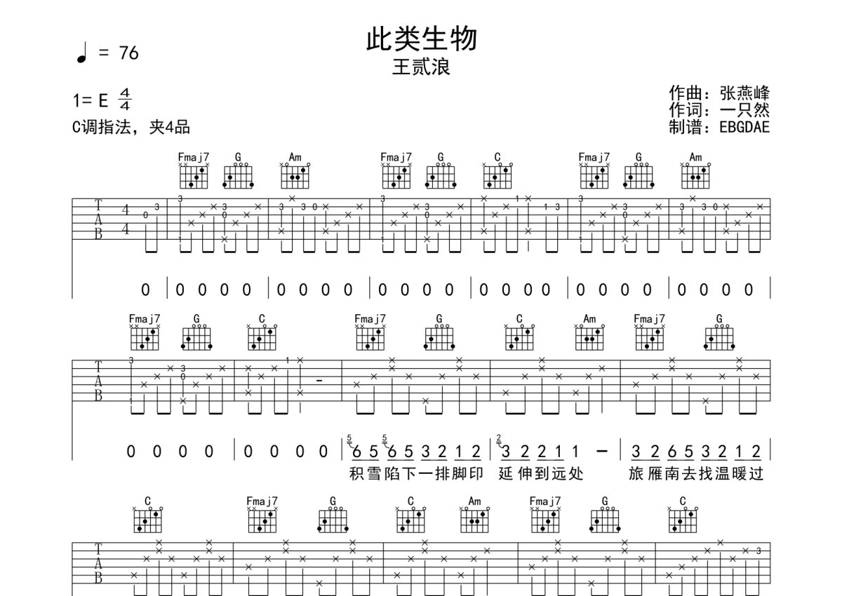 王贰浪《此类生物》吉他谱 - C调弹唱六线谱