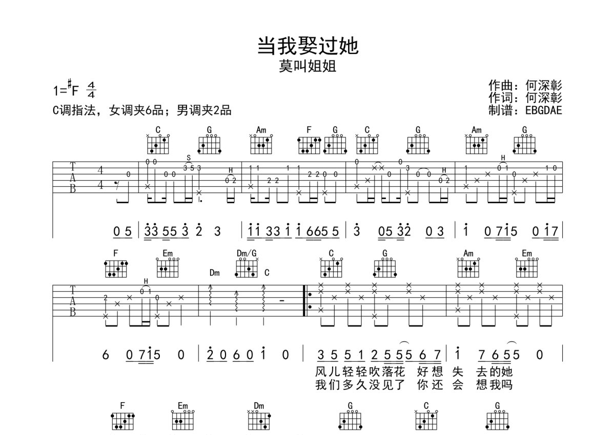 莫叫姐姐/何深彰《当我娶过她》吉他谱 - C调弹唱六线谱