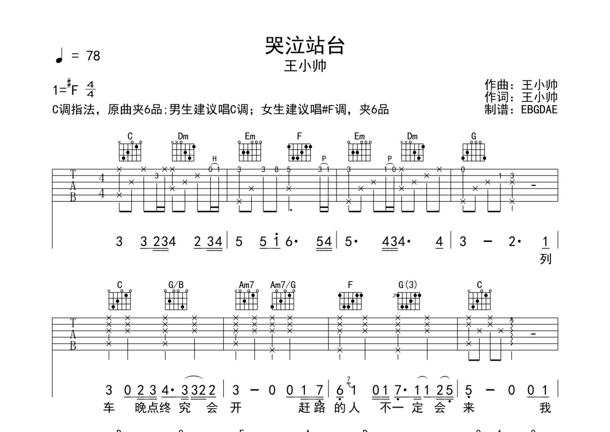 王小帅《哭泣站台》吉他谱 - C调弹唱六线谱